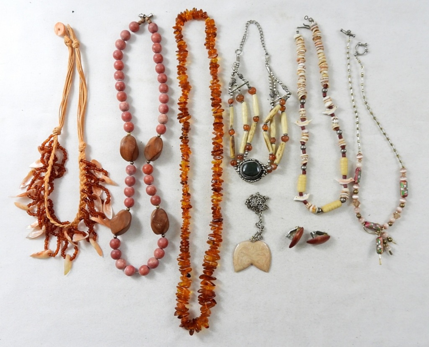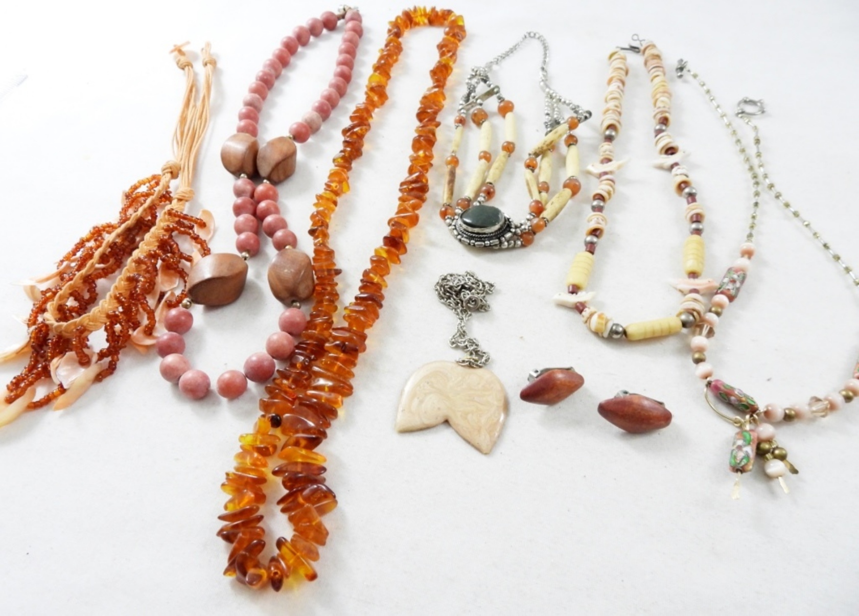 COOL SUMMER LOOK! – (7) NECKLACES VARIOUS LENGTHS & CLIP-ON EARRINGS – SOME NATURAL MATERAL MADE PIECES