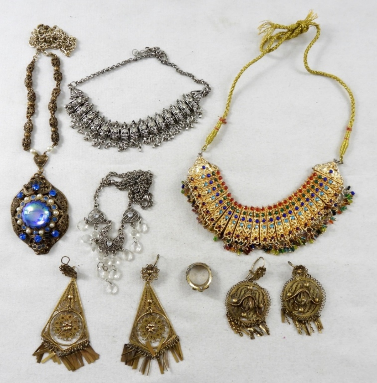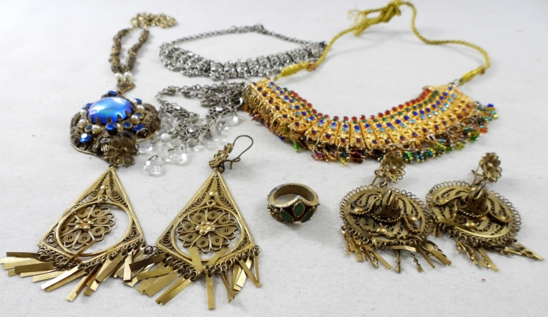 (2) CHOCKER STYLE NECKLACES, (2) VINTAGE FILIGREE CLIP-ON EARRINGS, (2) NECKLACES 16″ & 22″ BLUE STONE & RING SIZE 4.5