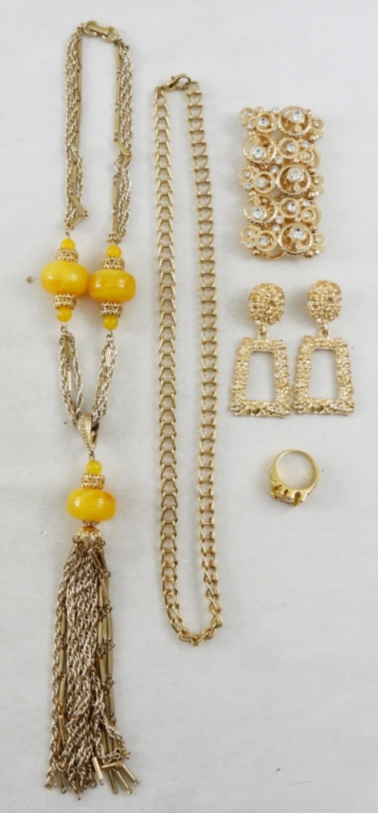 RING SIZE 10, 1 PAIR CLIP EARRINGS, 6IN BRACELET (STRETCHY), AND 2 NECKLACES –24 AND 18IN