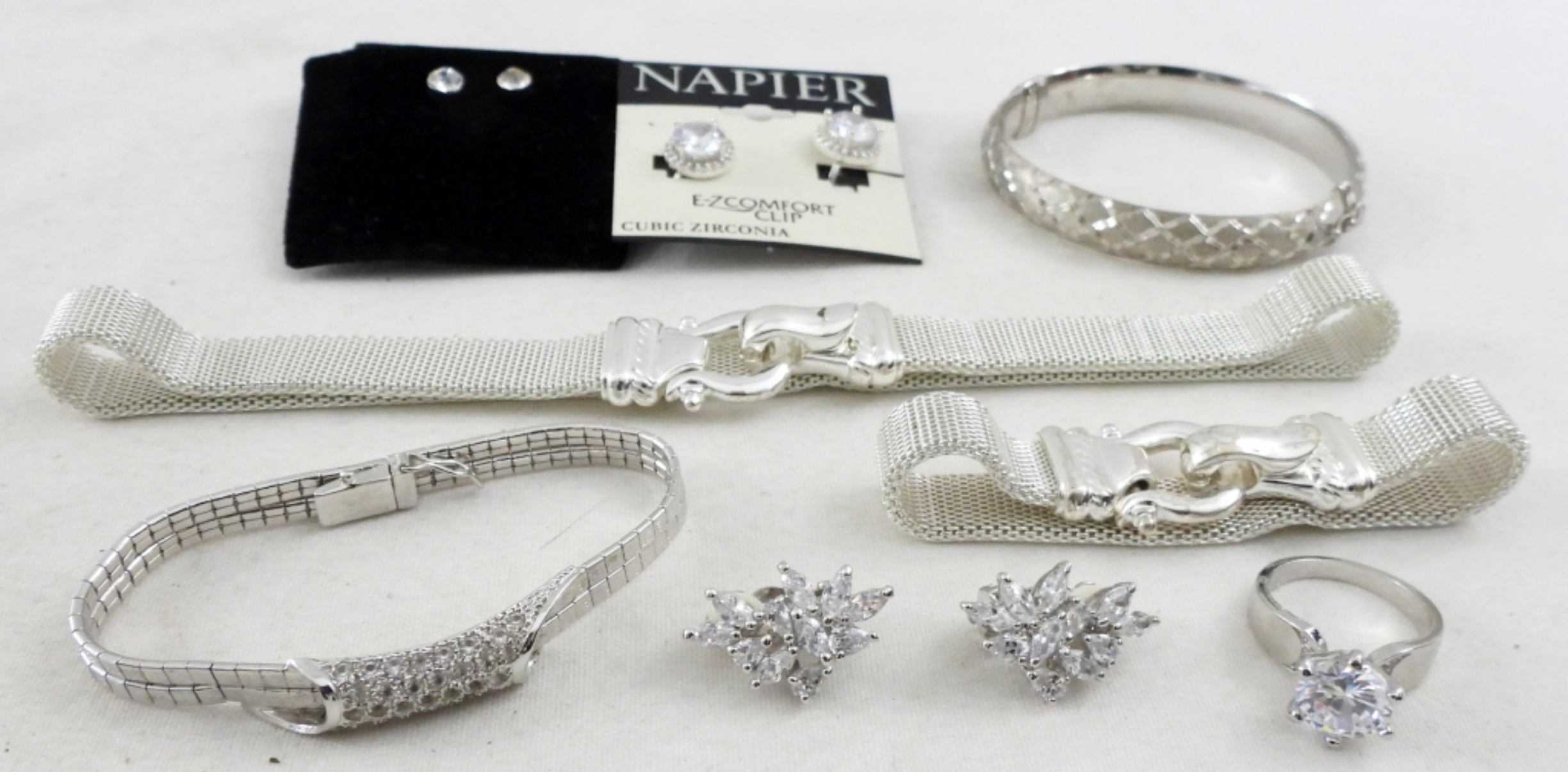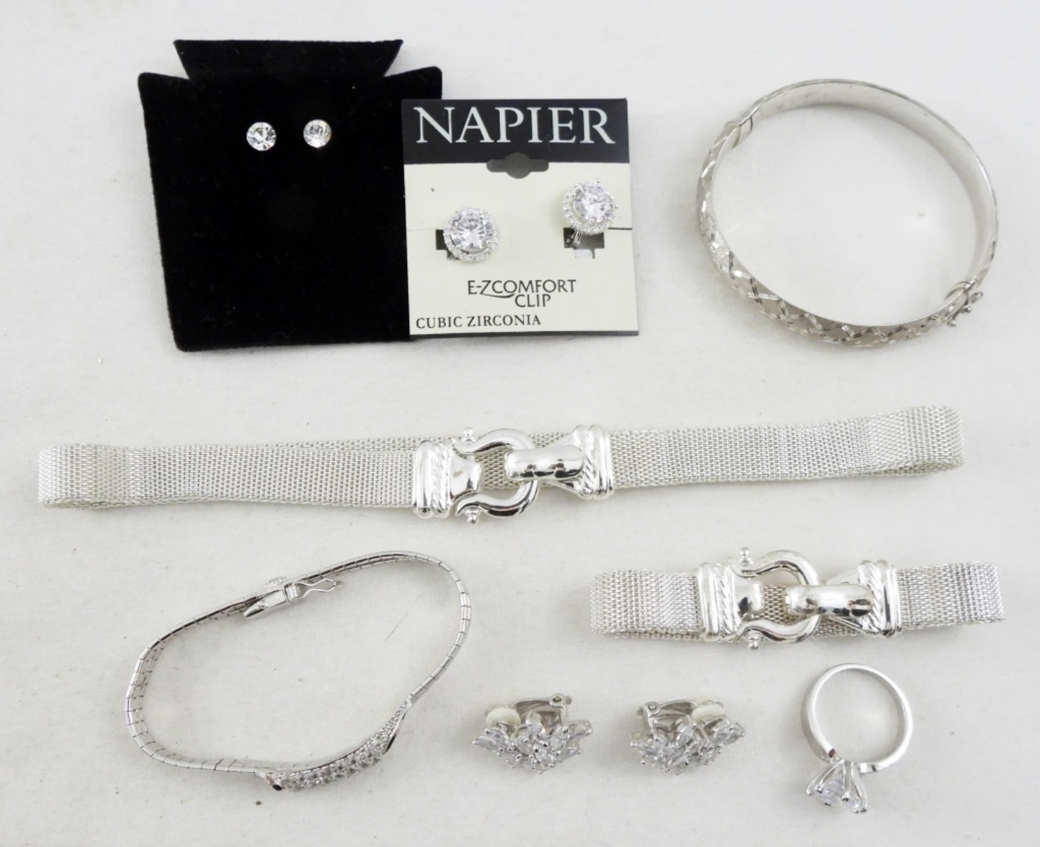 SILVER TONE LOT OF 2 BRACELETS, MATCHING NECKLACE AND BRACELET SET, 3 PAIRS OF DIAMOND LIKE EARRINGS AND ONE DIAMOND LIKE RING (SIZE 8)