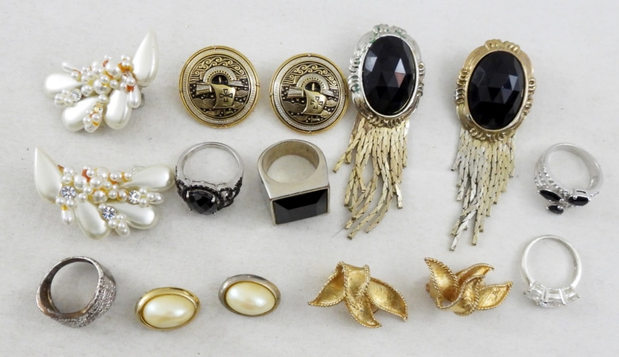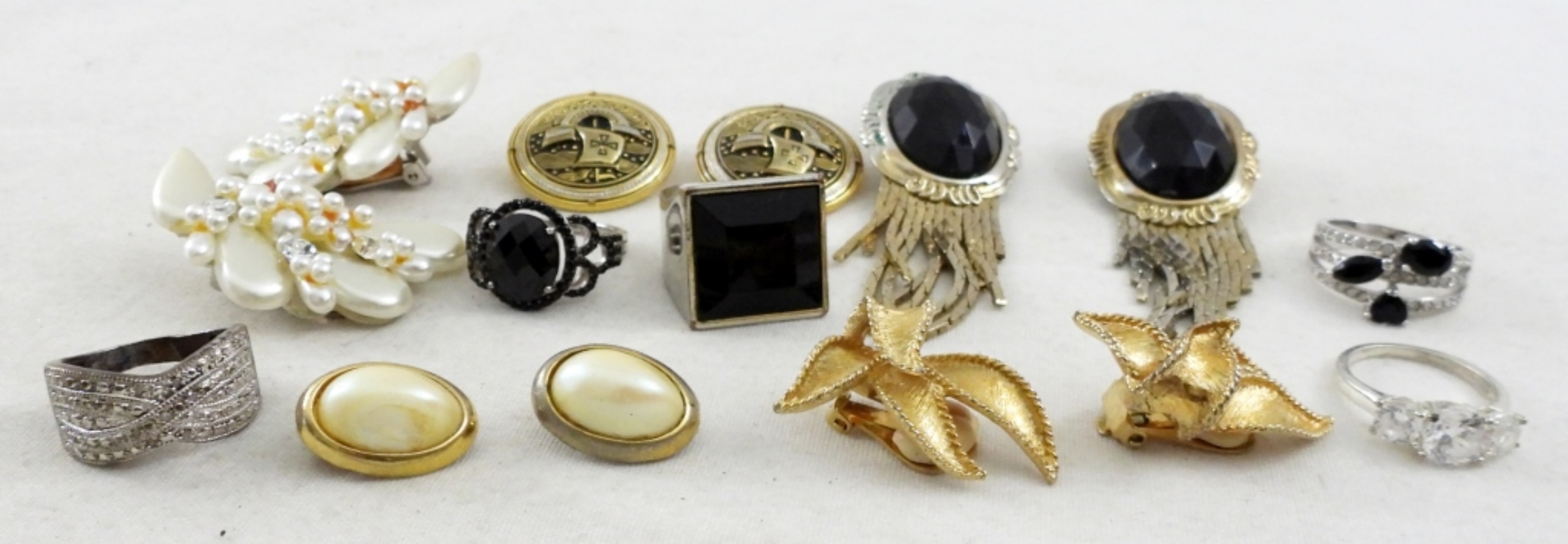5 RINGS (SIZES: 7-8), 5 CLIP ON EARRINGS (VARIOUS SHAPES/COLORS) MOSTLY GOLD/SILVER/WHITE TONES