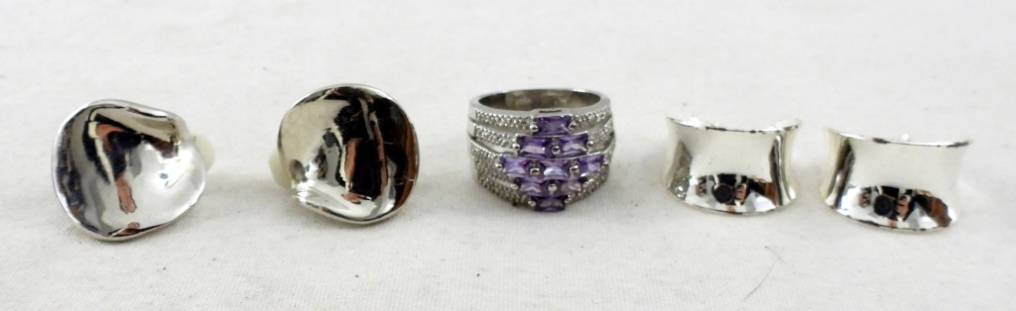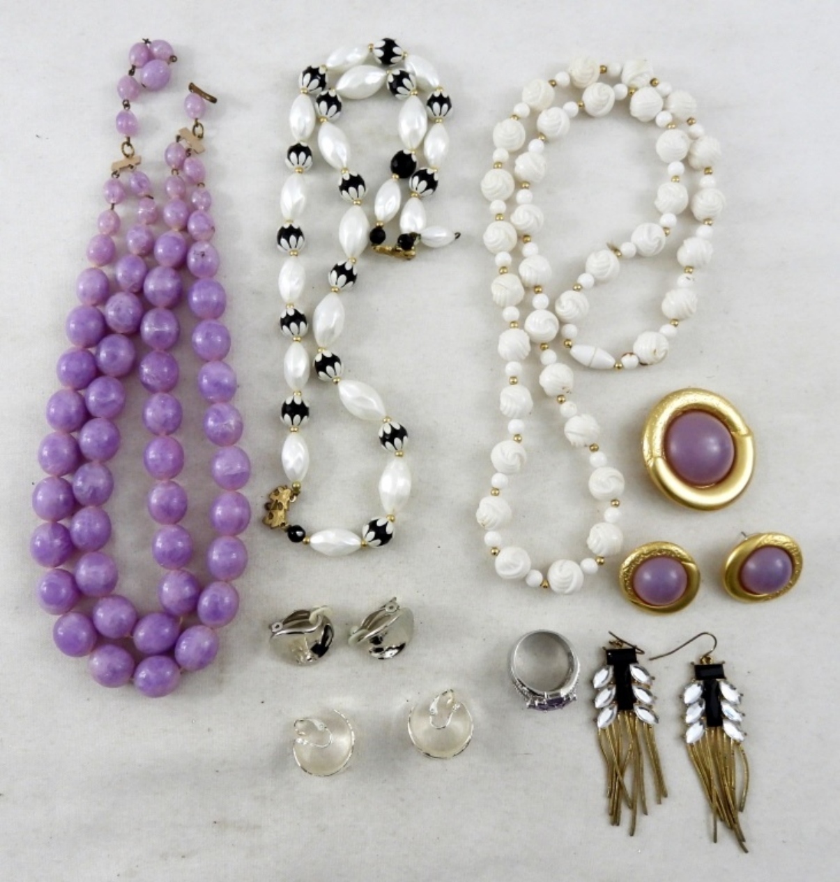 (X 4)NECKLACE LENGTHS 20-24IN, 1 PURPLE AND GOLD EARRING AND PIN SET, 1 PAIR DANGLE EARRINGS, 2 SILVER TONE EARRINGS AND 1 RING (SIZE 9)