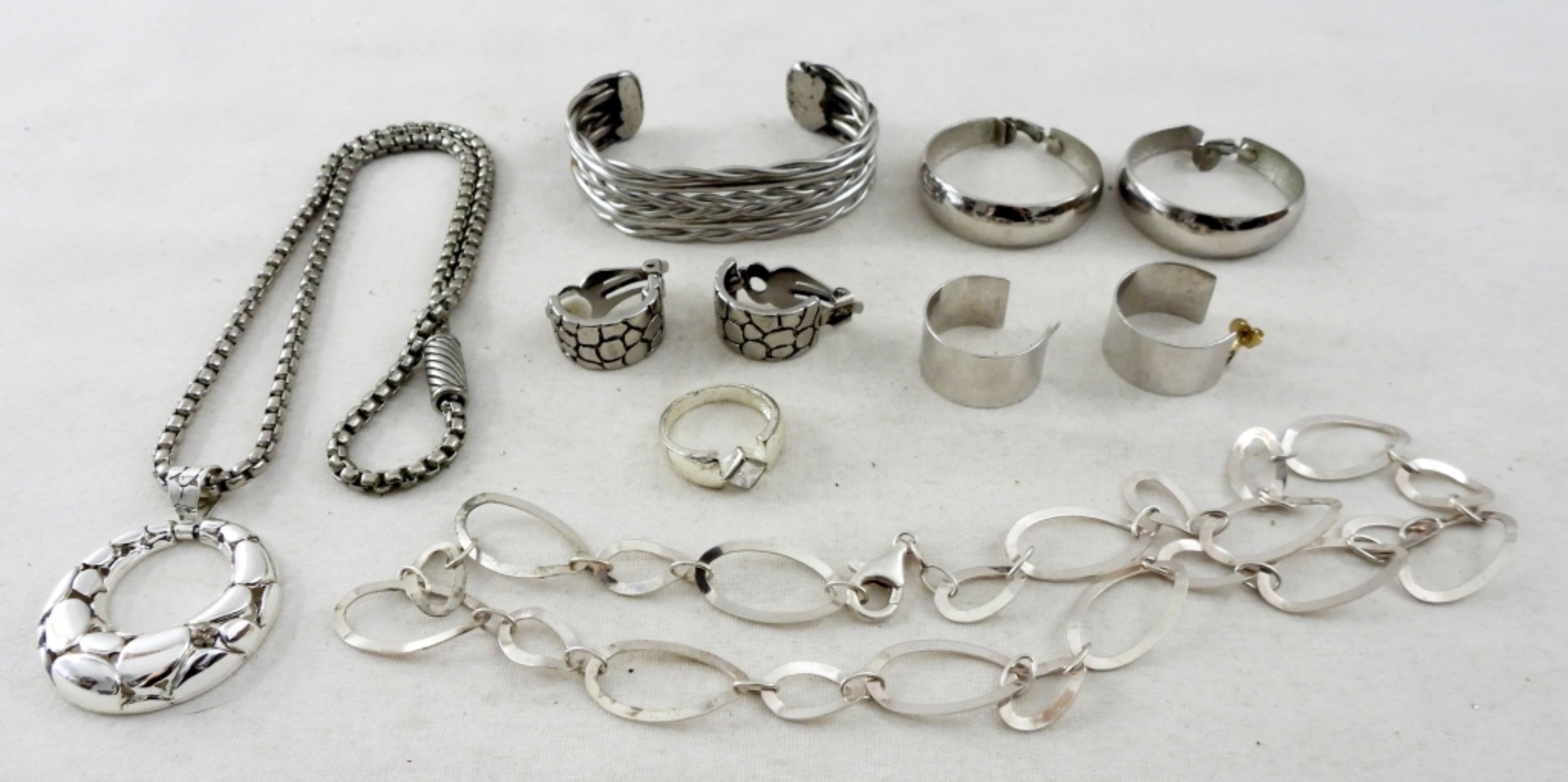 2 16IN NECKLACES, 3 EARRINGS, 1 RING (8.5 SIZE), AND 1 CUFF BRACELET