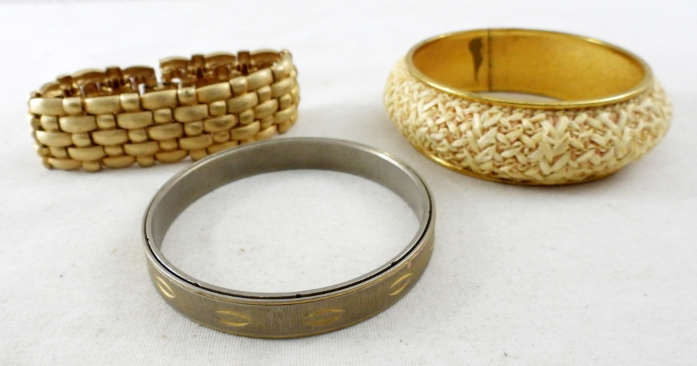 1 WOVEN BRACELET AND EARRINGS MATCHING SET, 1 STATEMENT PENDANT NECKLACE (24IN), AND 3 GOLD TONE BRACELETS