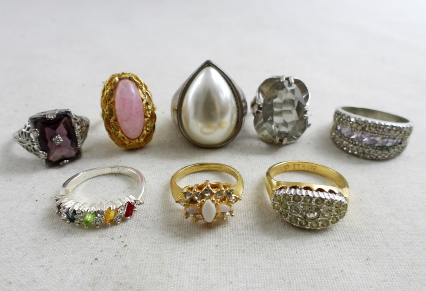 8 BEAUTIFUL GOLD & SILVER RING TONES. SIZES RANGE FROM 5-10. ALL IN GOOD CONDITION.