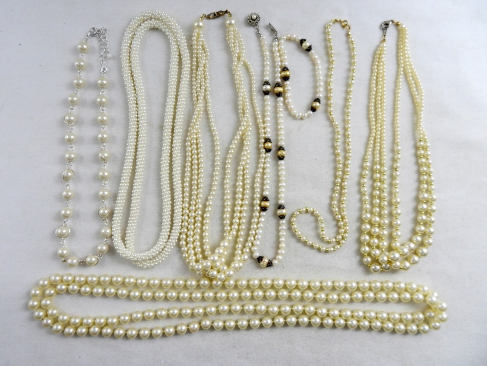8 STUNNING FAUX PEARL NECKLACES, SIZES RANGE FROM 14″-24″. ALL IN GOOD CONDITION.