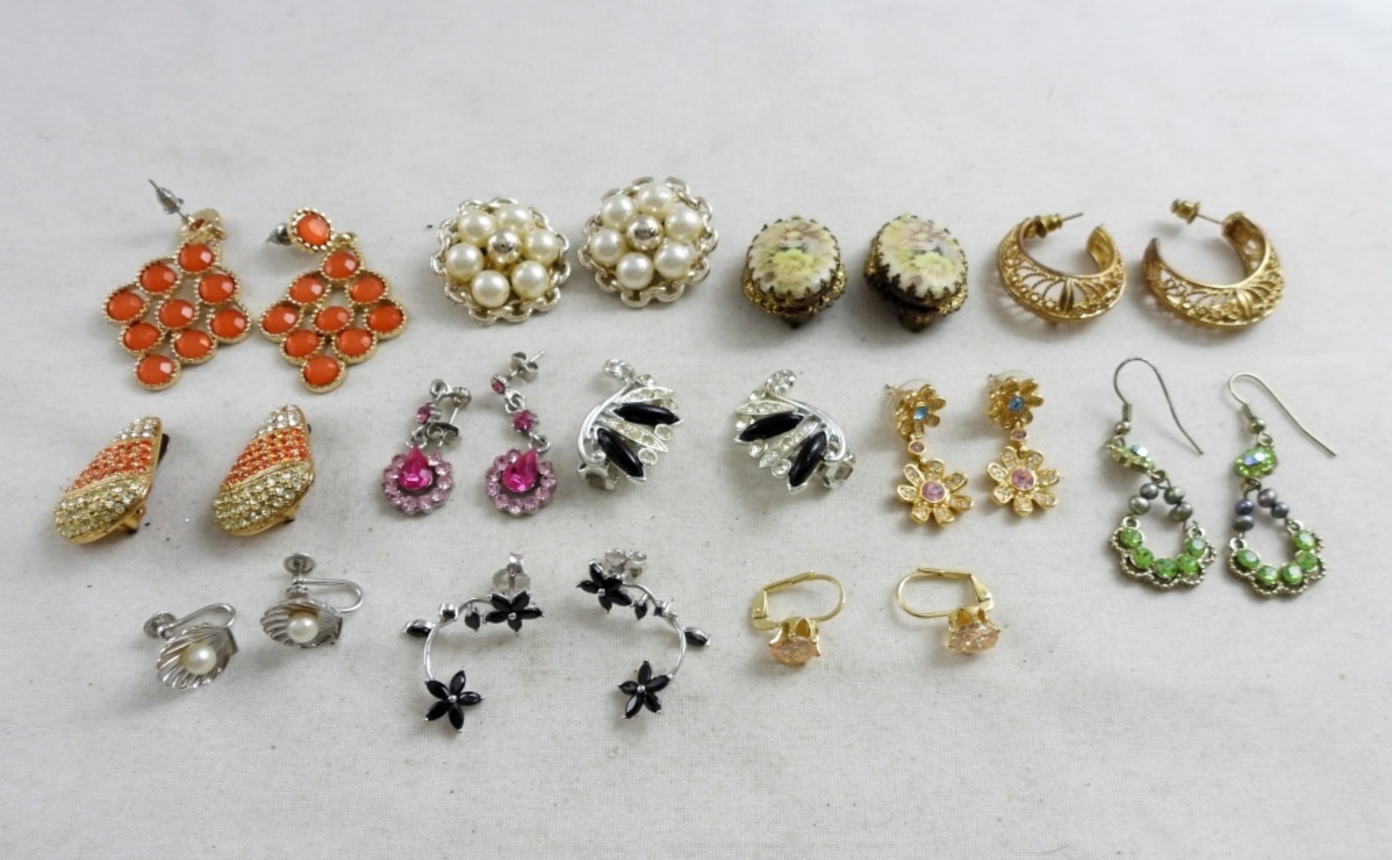 12 PAIRS OF RHINESTONE EARRINGS, THE COLORS VARY, SOME ARE THE CLIP-ON STYLE. 5 PAIRS THAT HAVE STUD BACKS WITH DROP STYLE PENDANTS. ALL IN GOOD CONDITION.