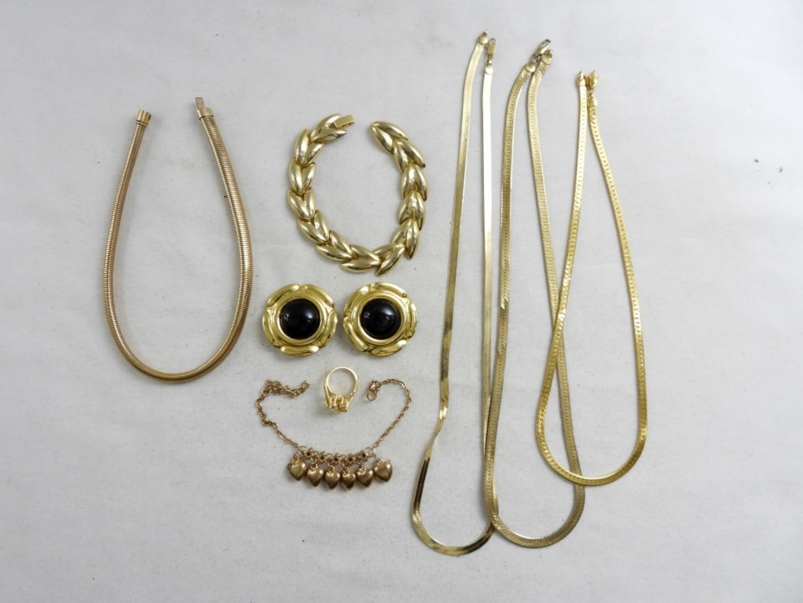 4 GOLD TONE NECKLACES LENGTH RANGE FROM 12″-24″, STUNNING HERRINGBONE STYLE. 2 GOLD TONE BRACELETS. 1 PAIR OF GOLD WITH BLACK STONE CENTER CLIP- ON EARRINGS, BEAUTIFUL RING SIZE 5. ALL IN GOOD CONDITION.