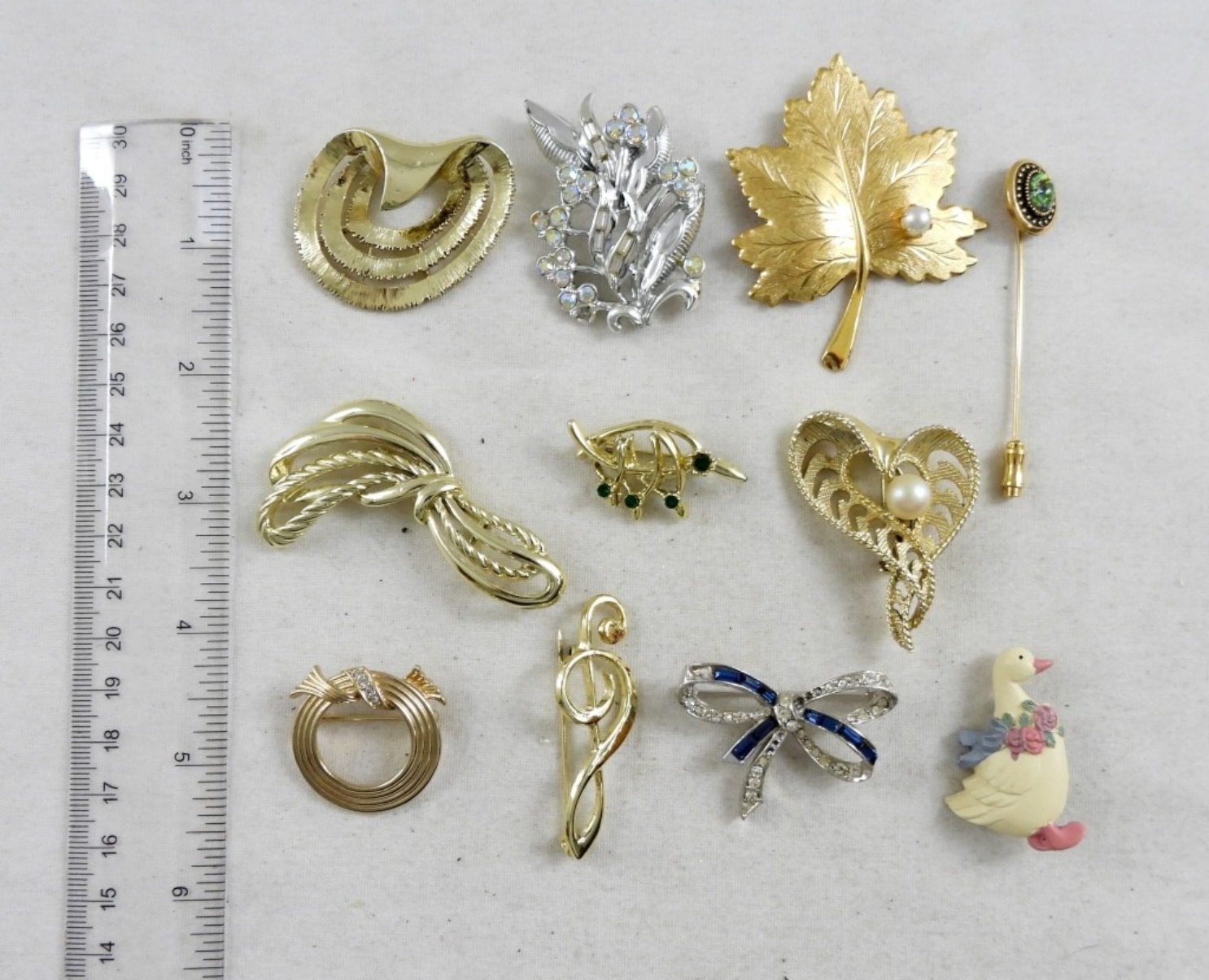 GOLD & SILVER TONE BROOCHES, DUCK BROOCH, LEAF WITH A FAUX PEARL BROOCH, MUSIC SIGN BROOCH, BOW BROOCH (IS MISSING A COUPLE OF RHINESTONES). ALL IN GOOD CONDITION.