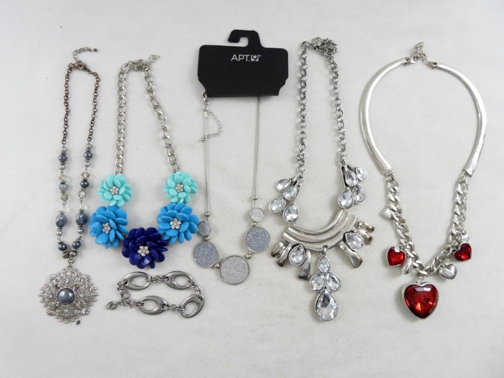 5 VTG BULKY NECKLACES, BLUE BEADED WITH RHINESTONES IN THE CENTER , SILVER TONE WITH RED RHINESTONE HEARTRS, ALL SILVER TONE CIRCLE PENDANTS, SILVER TONE NECKLACE WITH CLEAR RHINESTONS. LENGTHS ARE FROM 12″-16″.