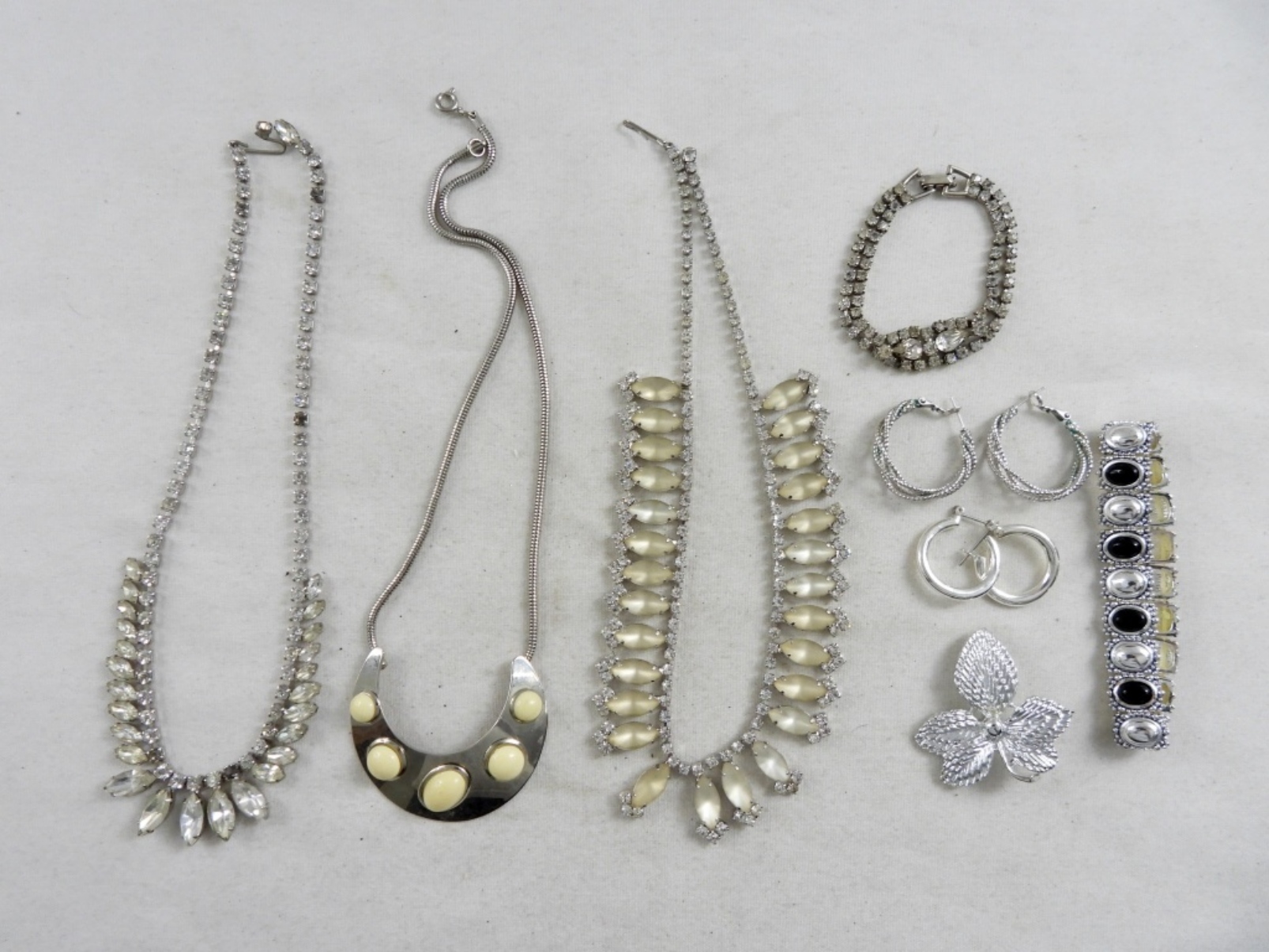 SILVER TONE BROOCH, SILVER TONE & BLACK STONE BRACELET,CLEAR RHINESTONE BRACELET, 2 PAIRS OF SILVER TONE HOOPS, 2 CLEAR RHINESTONE NECKLACES 16″, 16′ SILVER TONE WITH WHITE BEADS 16″. ALL IN GOOD CONDITION.