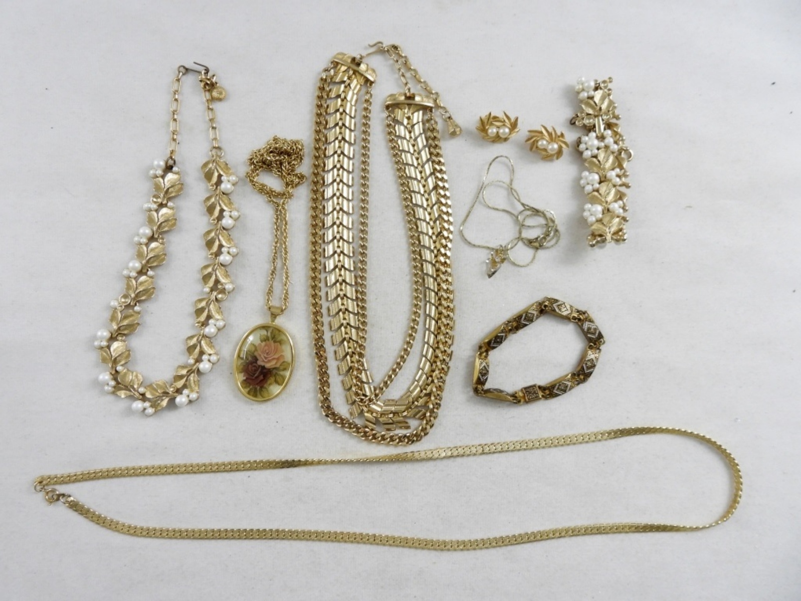 5 GOLD TONE NECKLACES, BEAUTIFUL GOLD TONED CHAIN 48″. 16″ GOLD TONE LEAVES WITH FAUX PEARLS MATCHING NECKLACE, BRACELET, & EARRINGS WITH CLIP-ON BACKING (MISSING SOME OF THE FAUX PEARLS).
