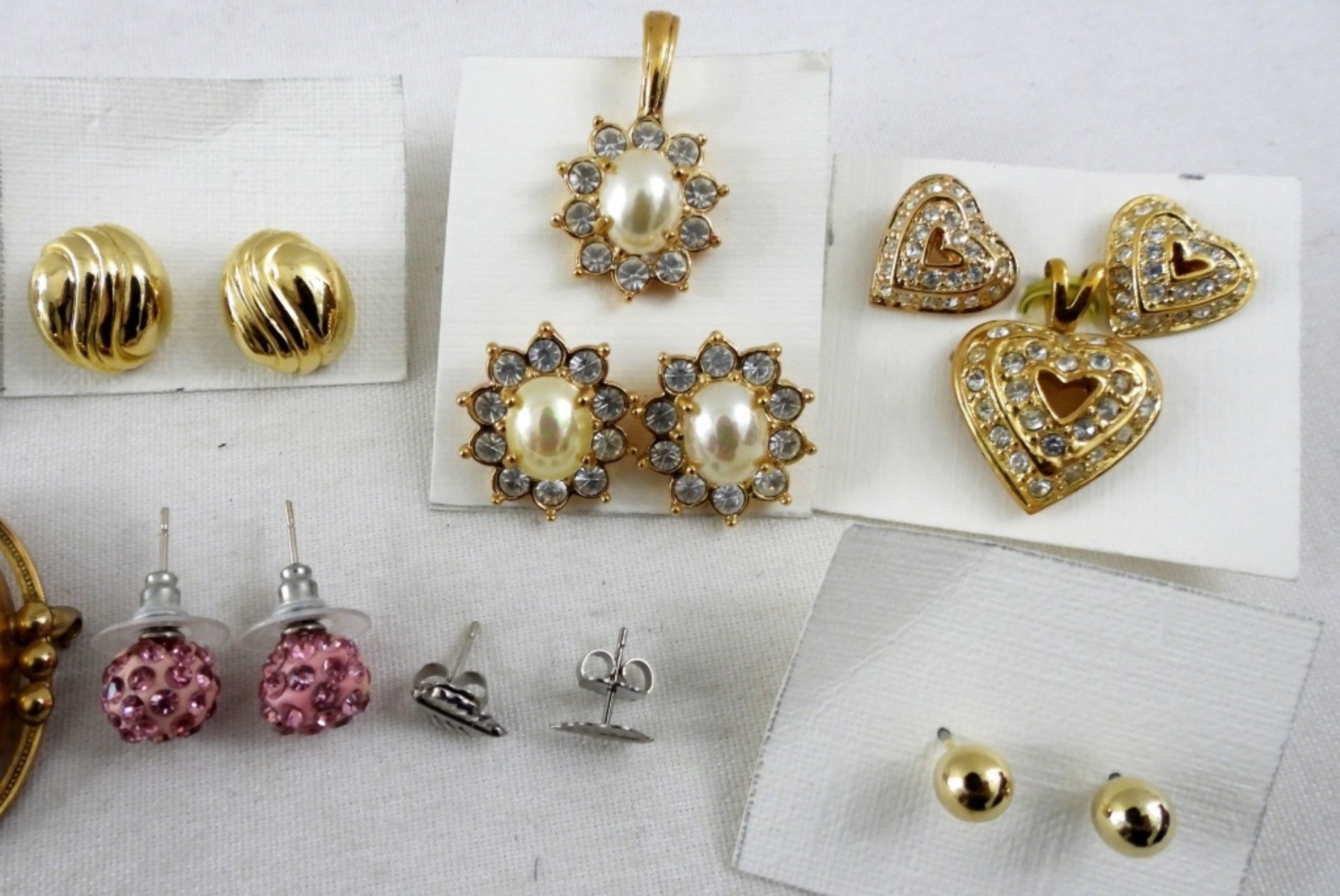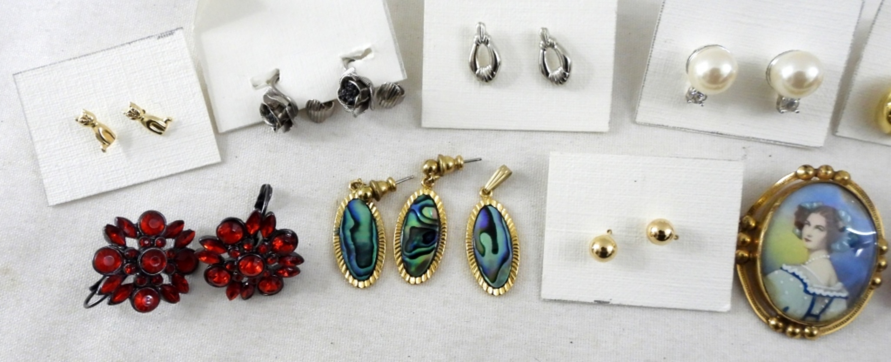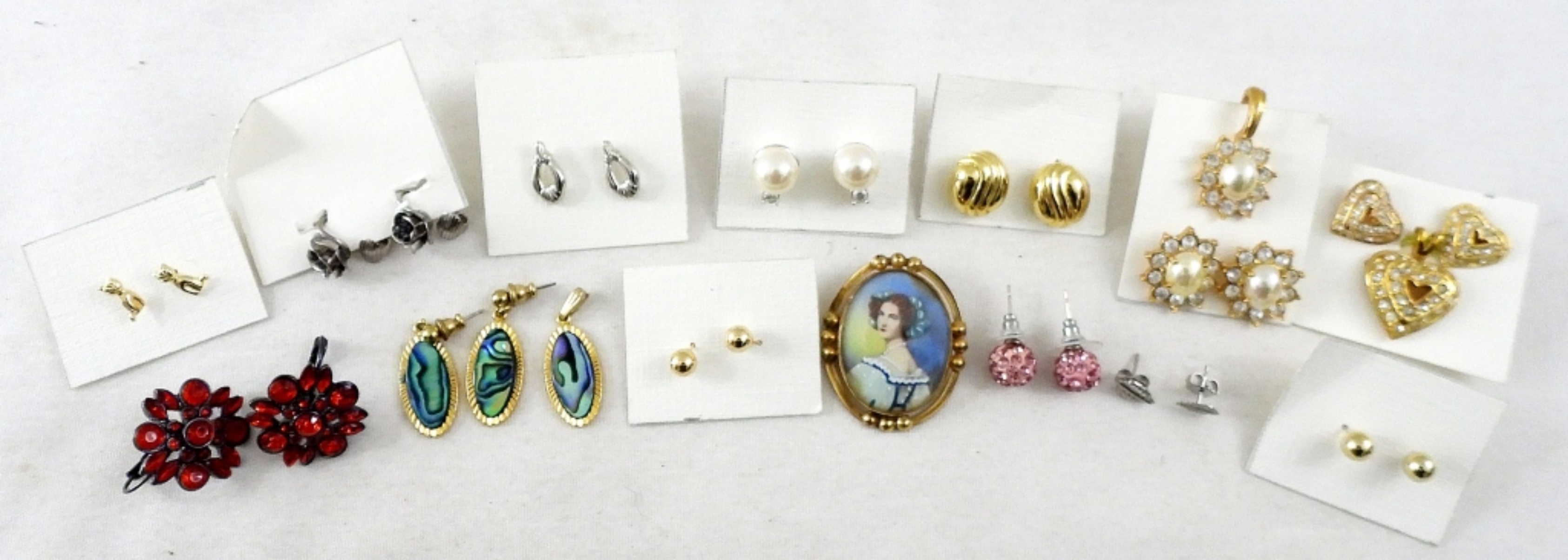 MIXED LOT OF EARRINGS- SOME GOLD TONE, SOME SILVER TONE, RHINESTONE, & PEARL. 11 PAIRS OF STUDS, 3 OF THOSE SETS COME WITH PENDANTS FOR A NECKLACE. 2 SETS OF CLIP-ON STYLE. GOLD TONED BROOCH. ALL IN GOOD CONDITION.