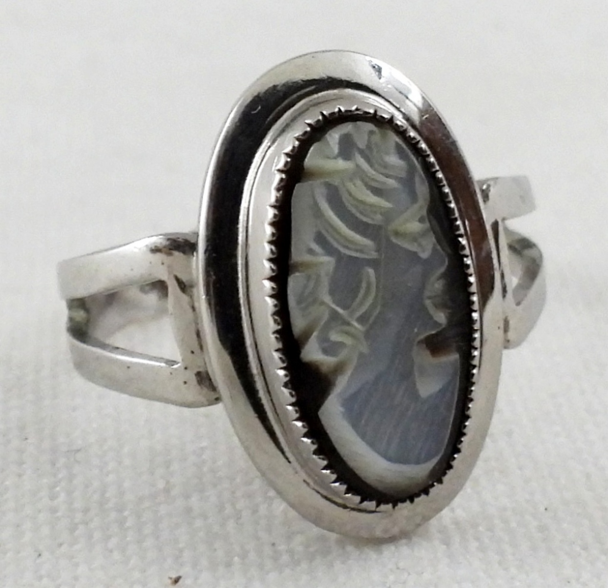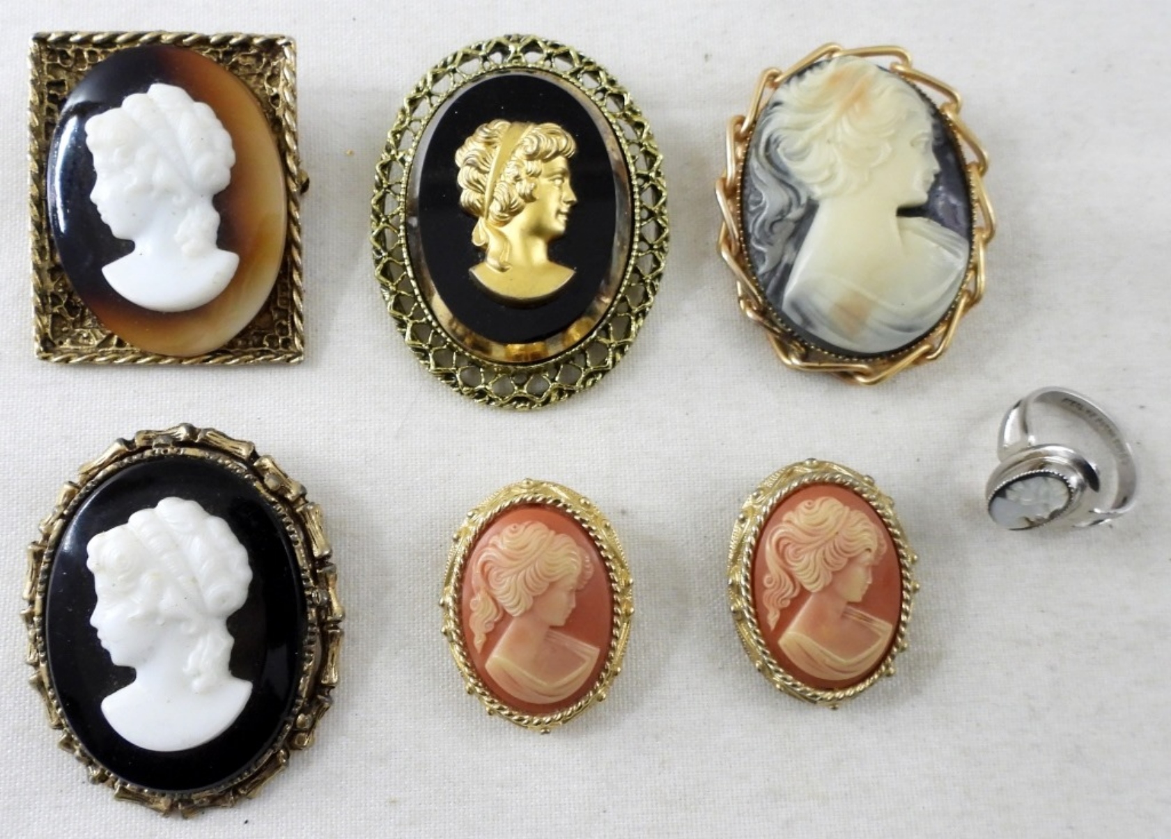 (6) CAMEO BROOCHES IN DIFFERENT COLORS & STYLES. 1- CAMEO RING SIZE 6. ALL IN GOOD CONDITION.