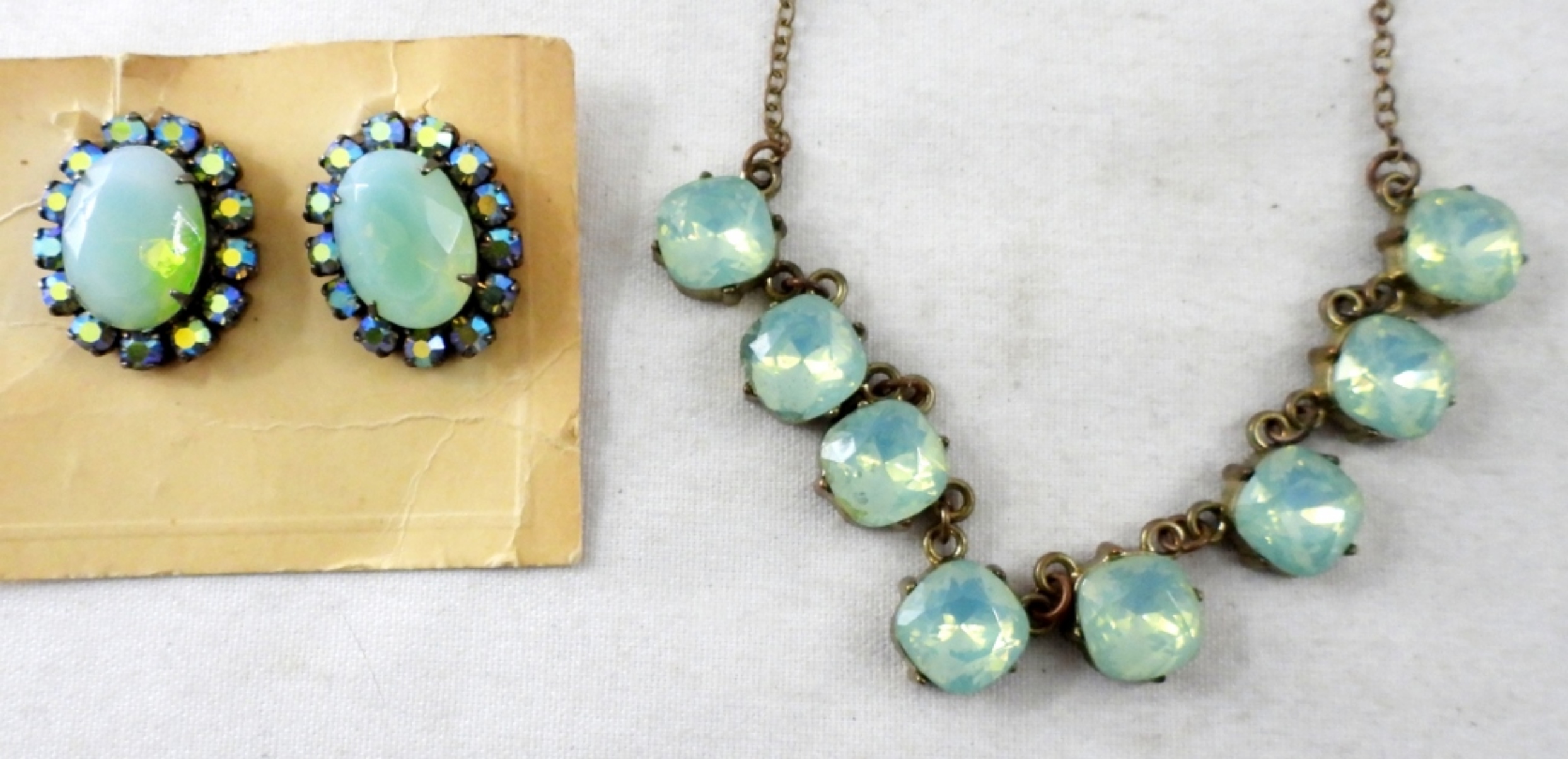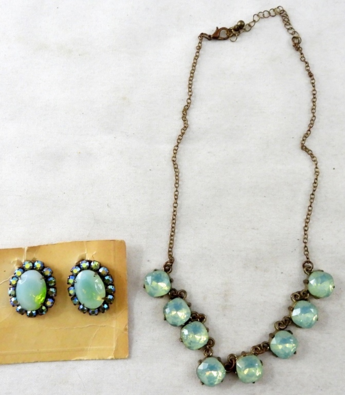 STUNNING BLUE STONE SET- COMES WITH A NECKLACE 16″. SET OF BLUE STONE CLIP-ON STYLE EARRINGS WITH RHINESTONES. ALL IN GOOD CONDITION.