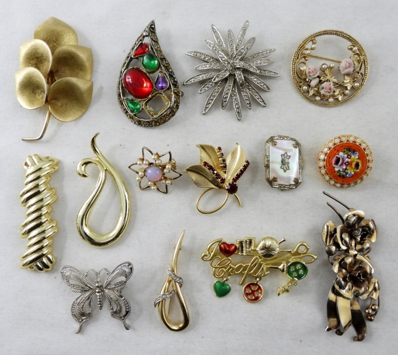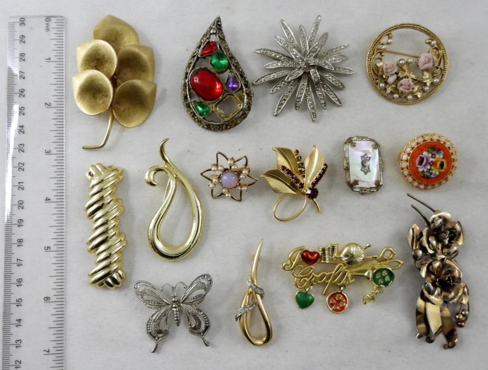 14 VINTAGE BROOCHES. ALL DIFFERENT SOME WITH RHINESTONES SOME GOLD TONES & SILVER TONES. ALL IN GOOD CONDITION.