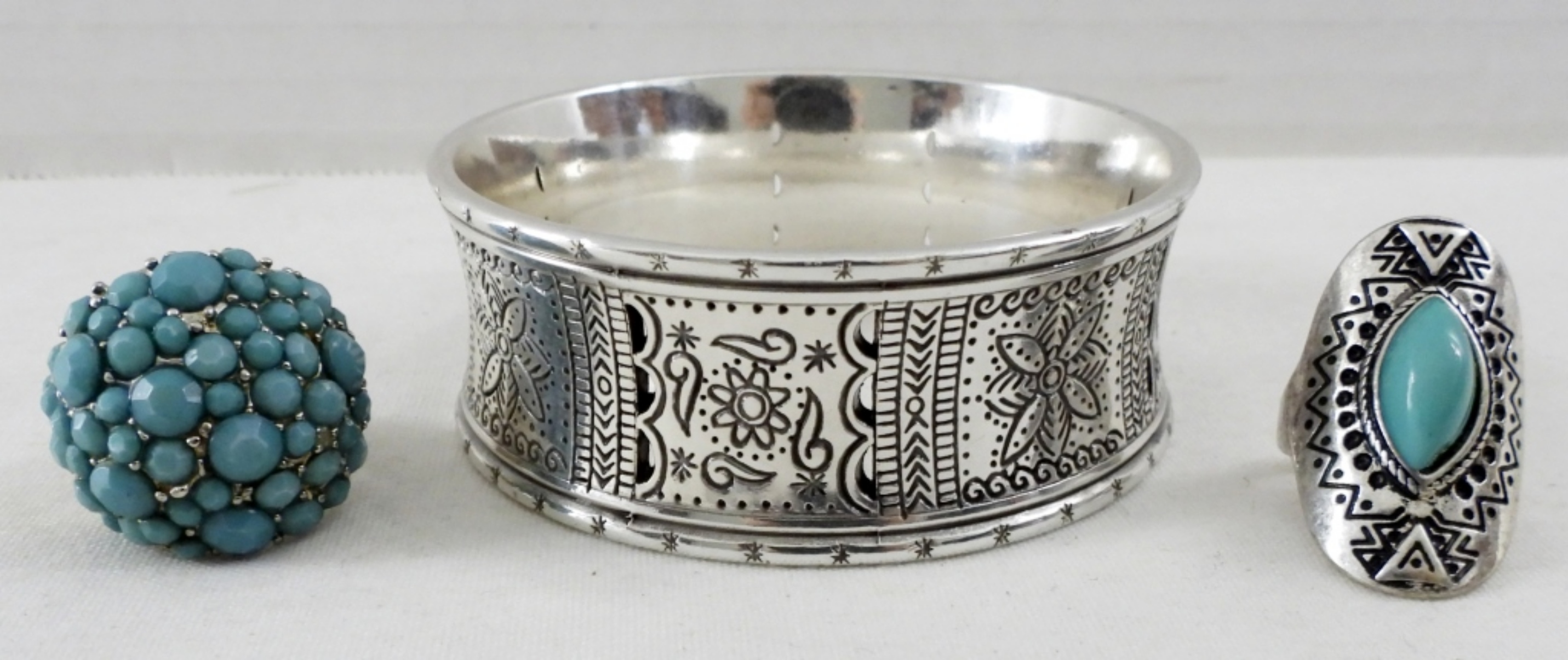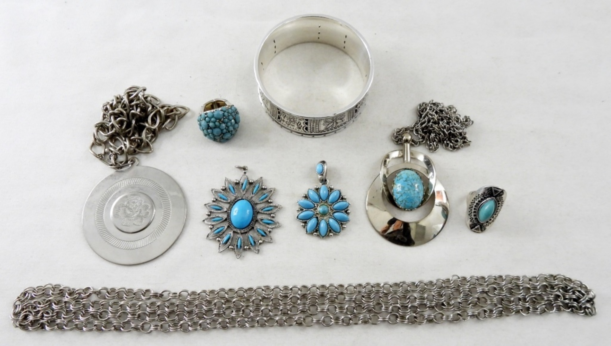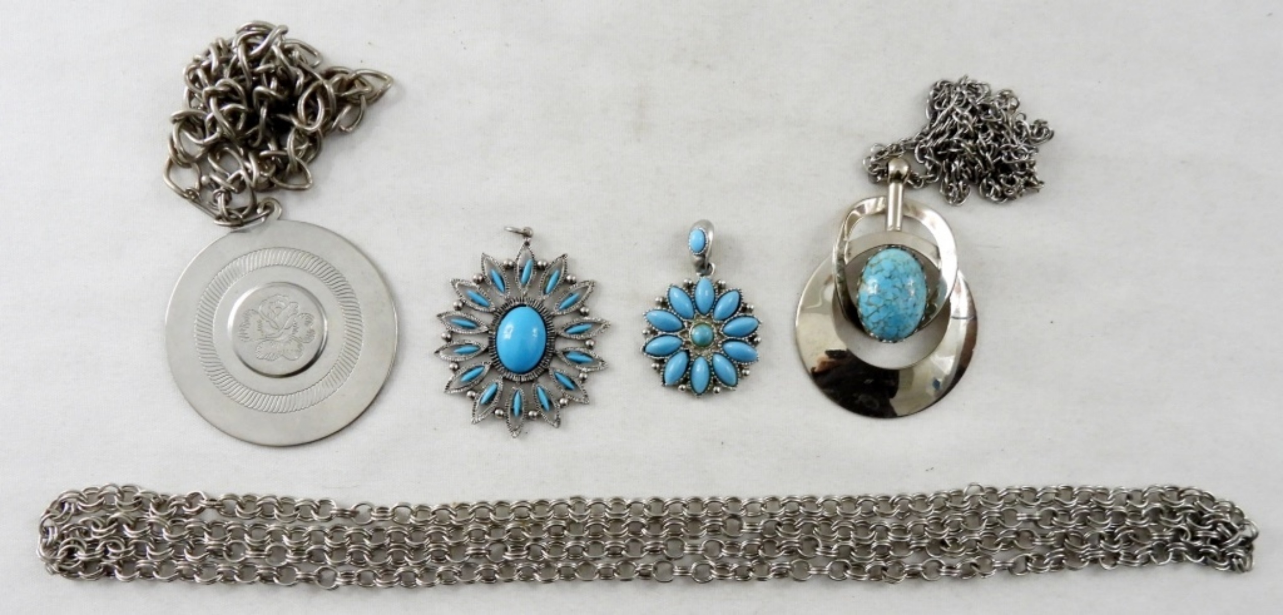 2- SILVER TONE NECKLACES ONE WITH STUNNING BLUE STONE ON PENDANT. 2 BLUE STONE STYLE PENDANTS. 1- BLUE STONE WITH SILVER TONES RING SIZE 7. 1 RING THAT ONE SIZE FITS ALL WITH BEAUTIFUL BLUE STONES. STUNNING SILVER