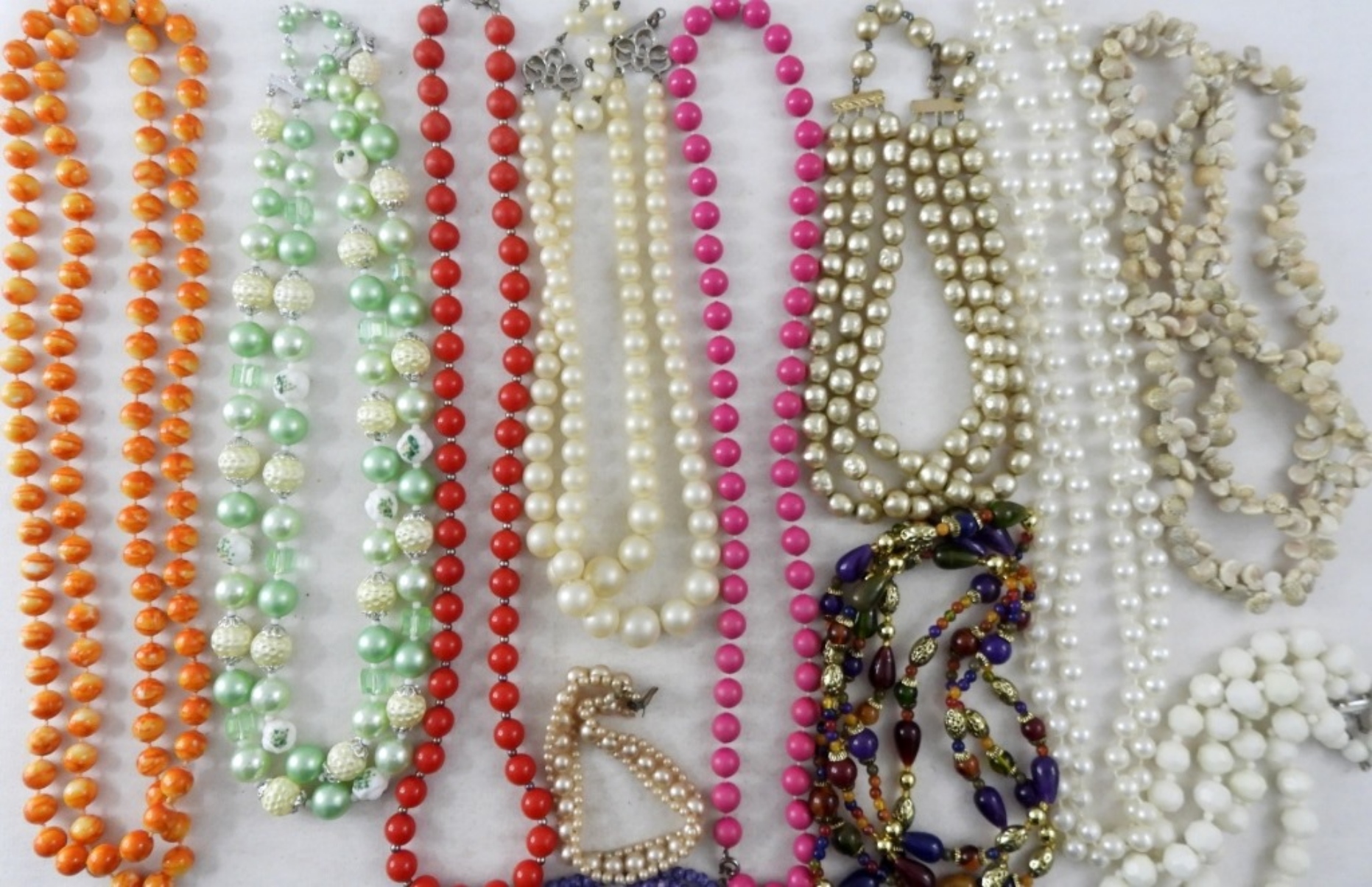 MIXED LOT OF BEADED NECKLACES, WITH A VARIETY OF COLORS. ALL IN GOOD CONDITION.