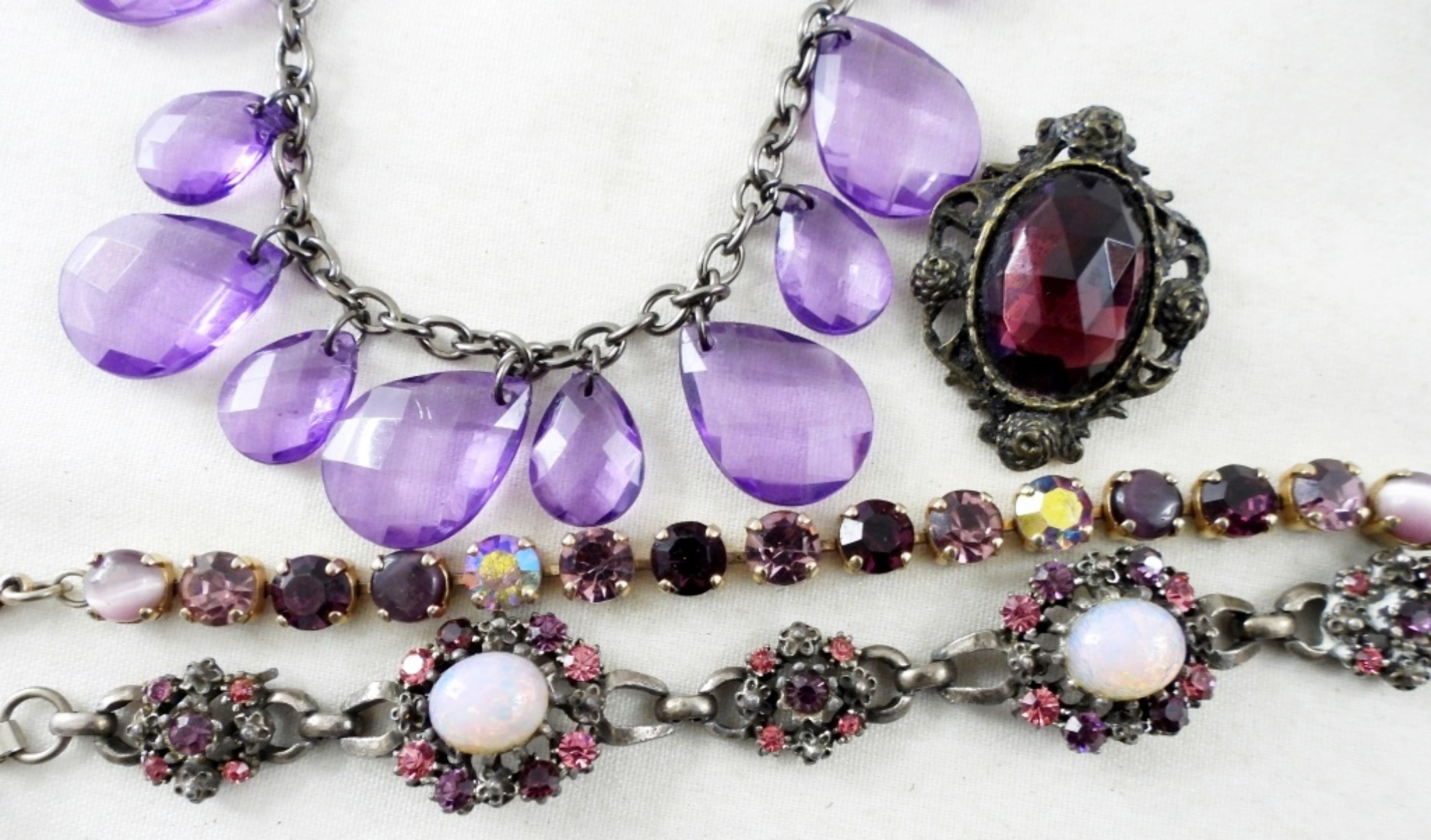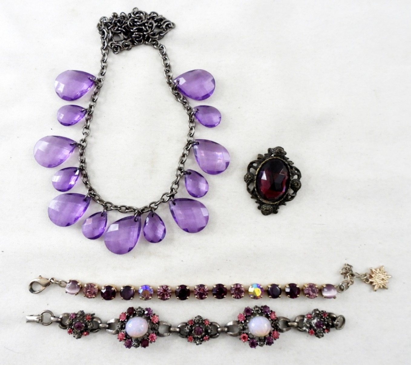 1 -16″ PURPLE STONE STYLE NECKLACE, 1- PURPLE STONE WITH GOLD TONE BROOCH, 2 STUNNING BRACELETS WITH PURPLE & PINK RHINESTONE BOTH IN A GOLD TONE. ALL IN GOOD CONDITION.