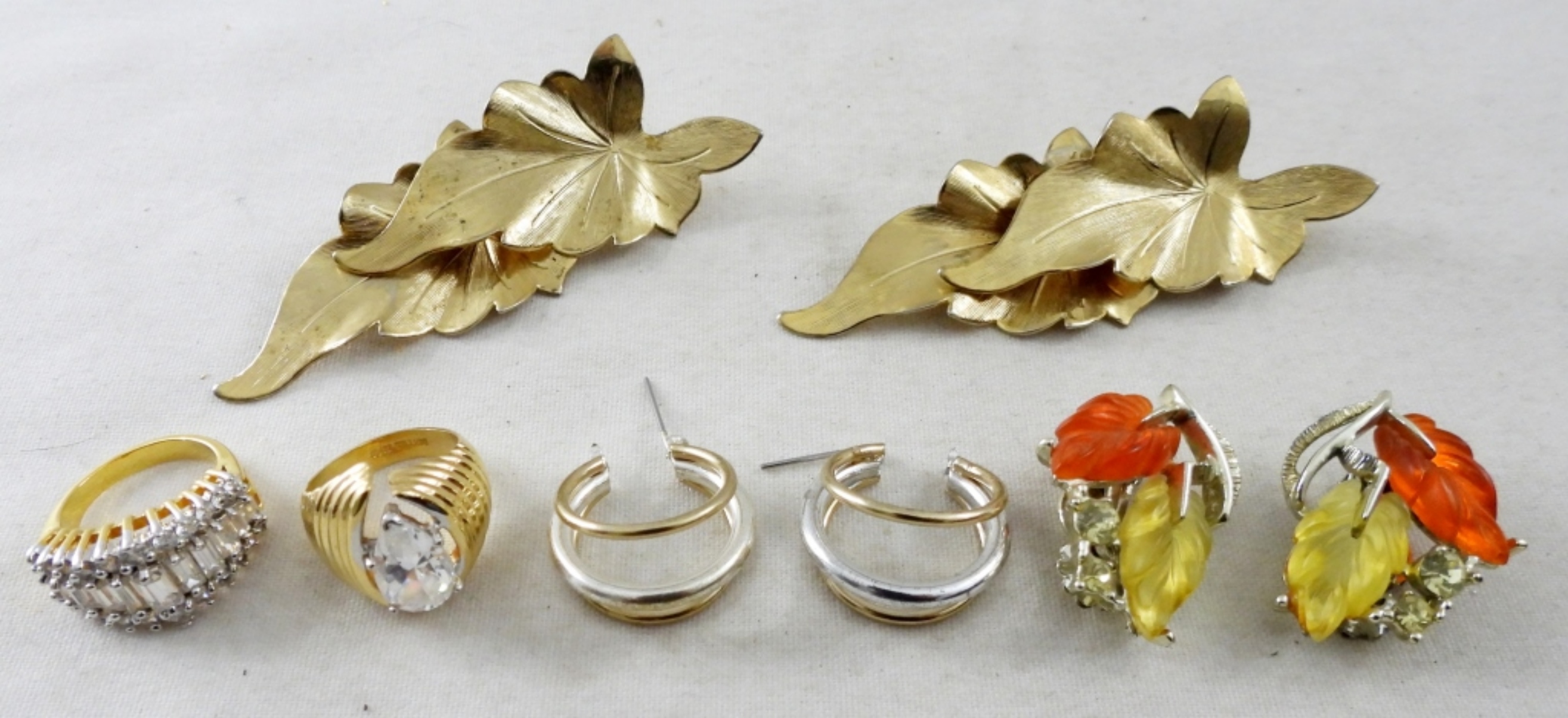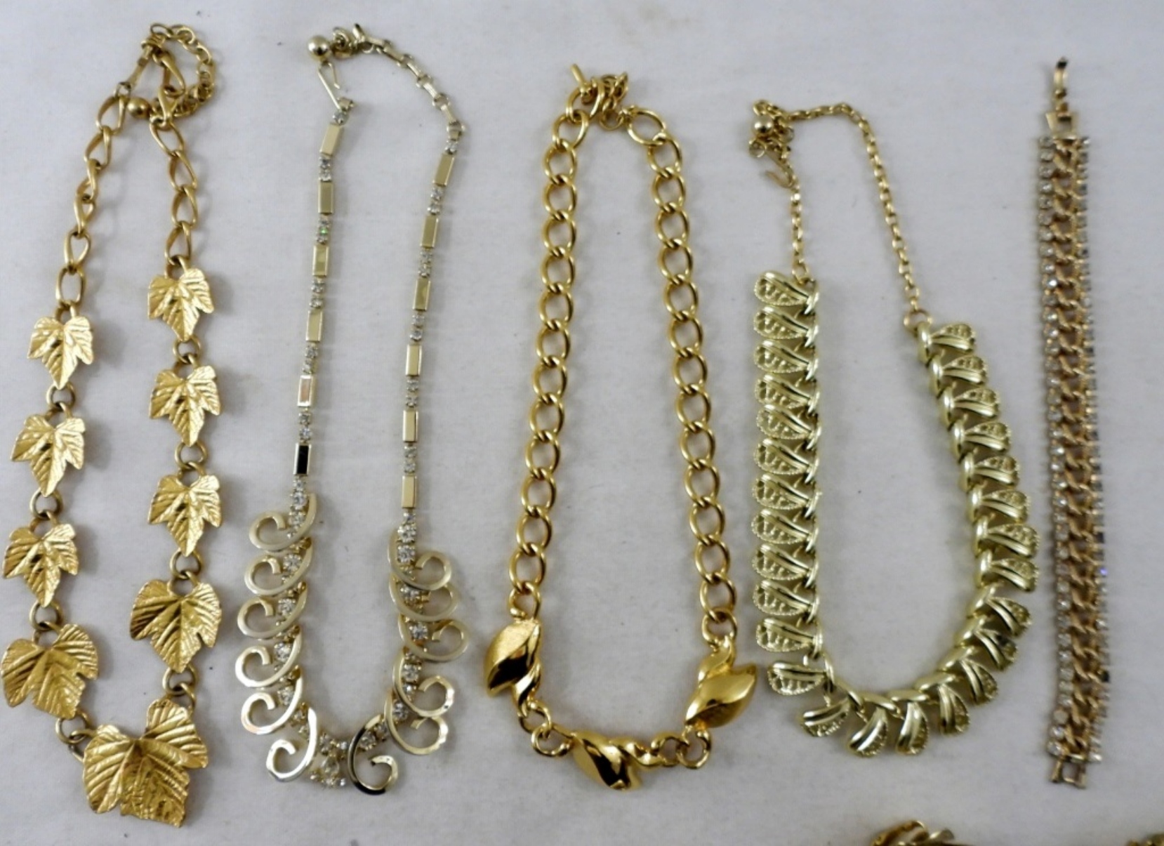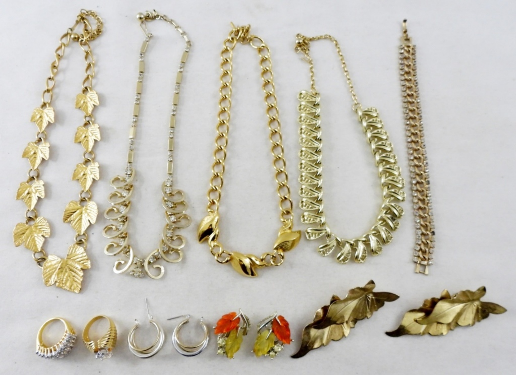 2 SETS OF CLIP STYLE BACKS GOLD TONE LEAF EARRINGS. 2 FALL INSPIRED NECKLACES IN GOLD TONES BOTH 14″, GOLD TONE BRACELET WITH CLEAR RHINESTONES ( IS MISSING ONE RHINESTONE), 2 STUNNING GOLD TONE 16″ NECKLACES ONE WITH