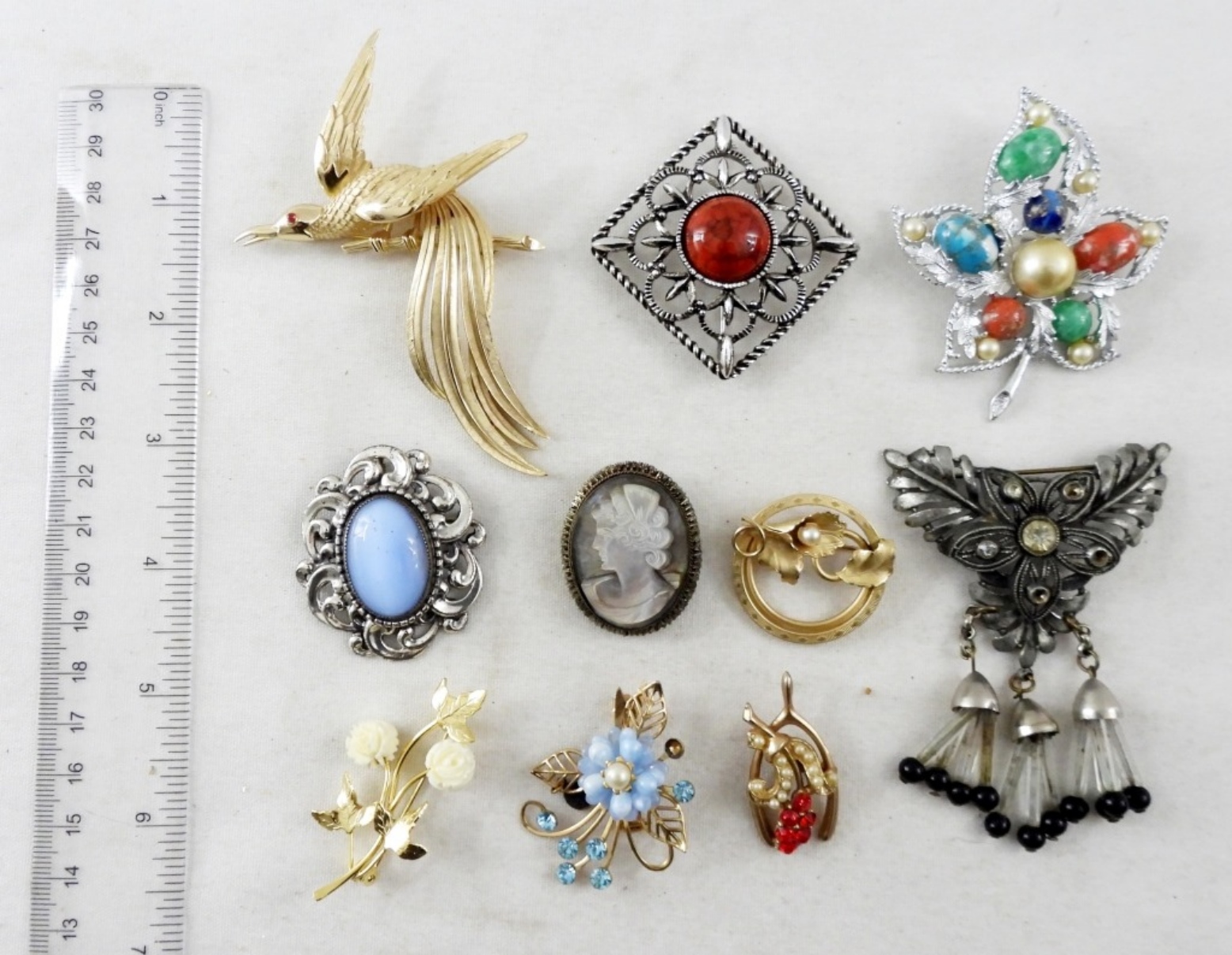 10 BROOCHES ALL TOGETHER- THIS COLLECTION CONTAINS A STUNNING CAMEO BROOCH, BLUE STONE BROOCH, VTG FLOWER BROOCH AND OTHERS. ALL IN GOOD CONDITION.