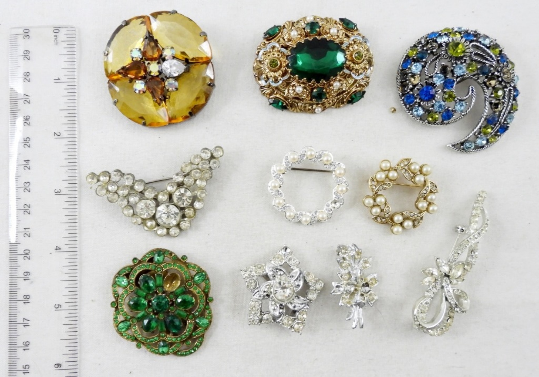 BEAUTIFUL COLLECTION OF BROOCHES IN GOLD AND SILVER TONES. GREEN RHINESTONE BROOCH (ONE RHINESTONE IS LOOSE), MIX BLUE RHINESTONE BROOCH, VIOLIN RHINESTONE BROOCH, PEARL & LEAF BROOCH IN GOLD TONE.