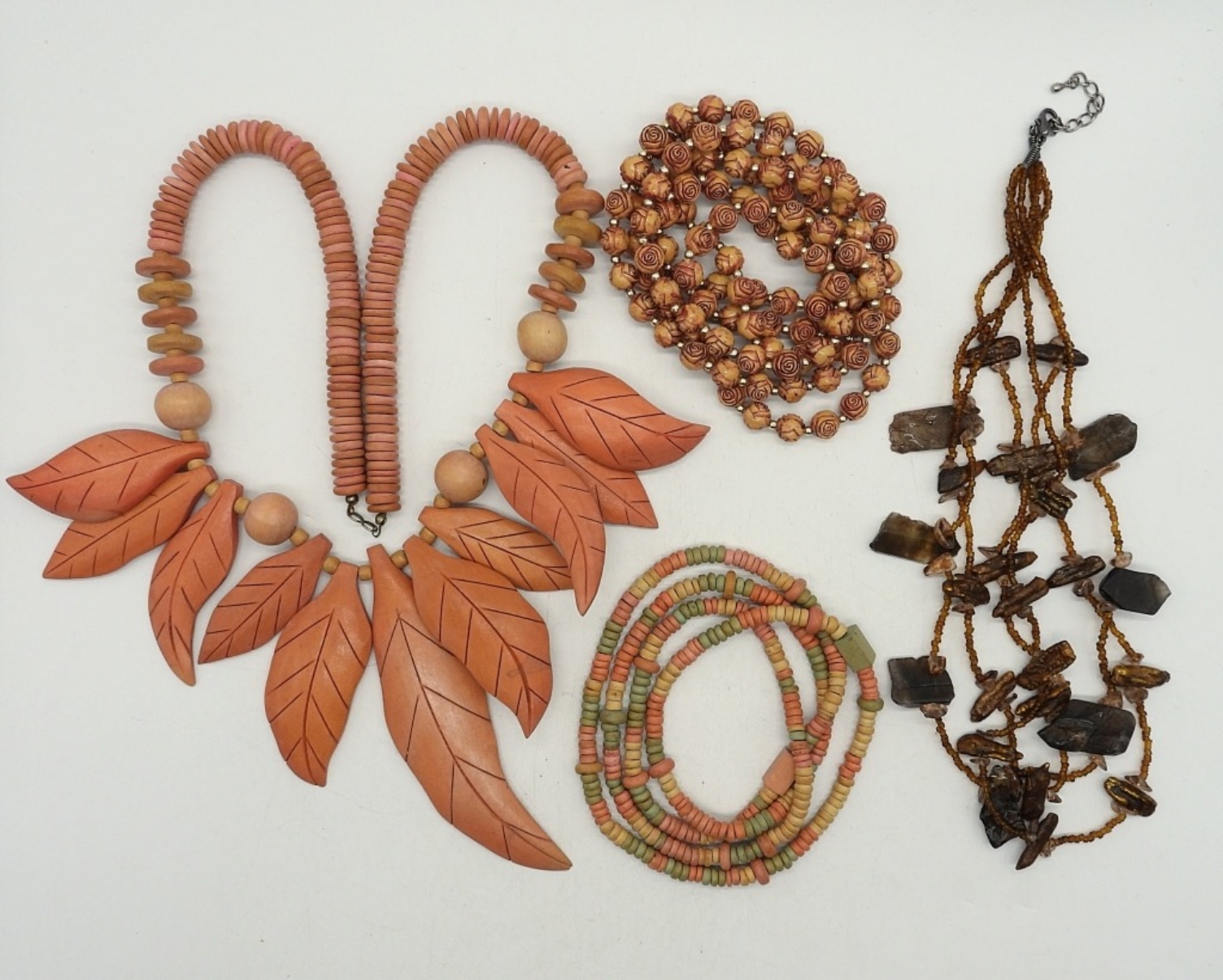 FOUR NECKLACES WITH WOODEN BEADS & GEMSTONES. 17-48″.