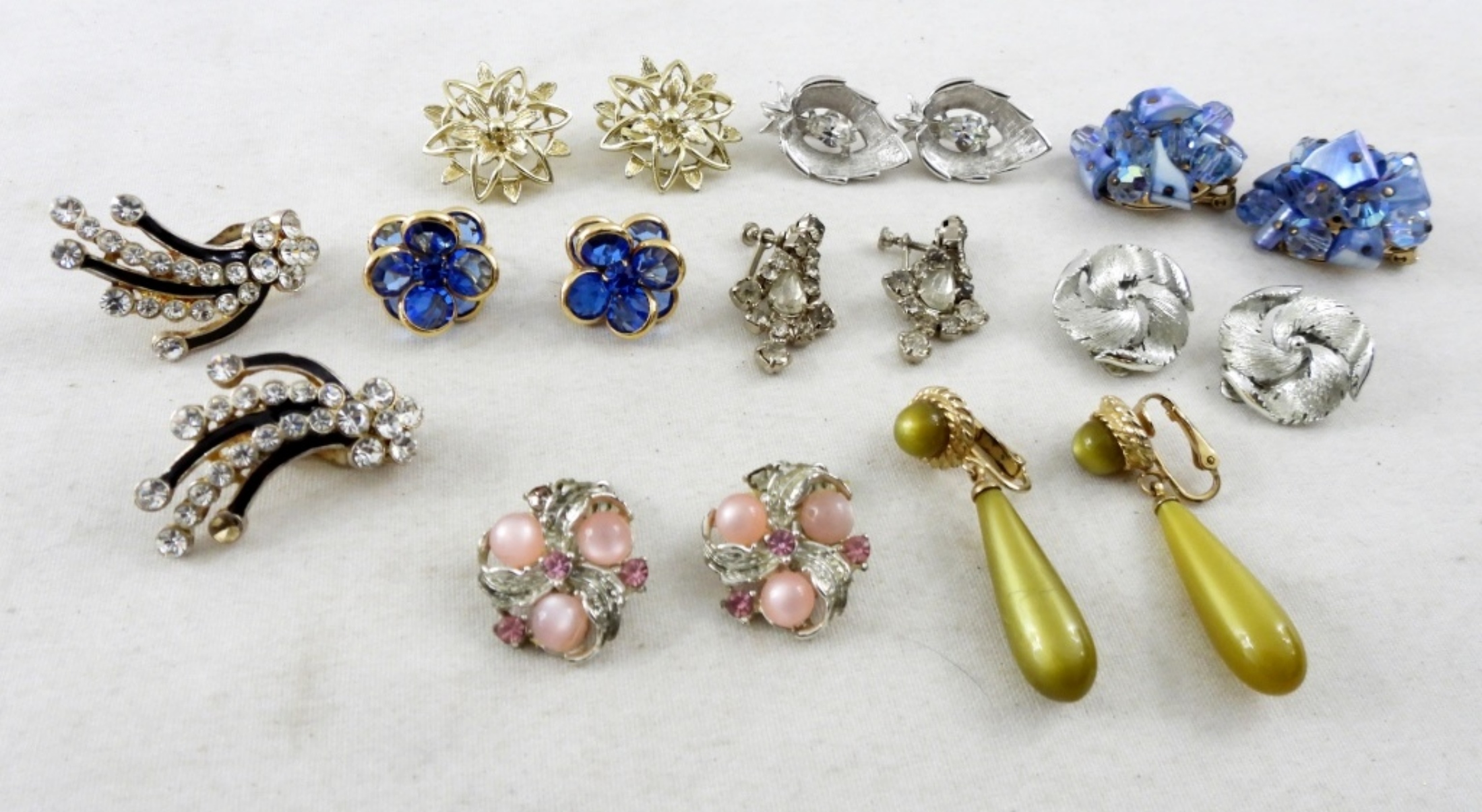 MIXED LOT OF CLIP ON EARRINGS- SOME GOLD TONE & SOME SILVER TONE. BLUE FLORAL WITH GOLD TONES. PINK WITH SILVER TONE FLOWERS. GREEN PENDANT WITH GOLD TONES. ALL IN GOOD CONDITION.