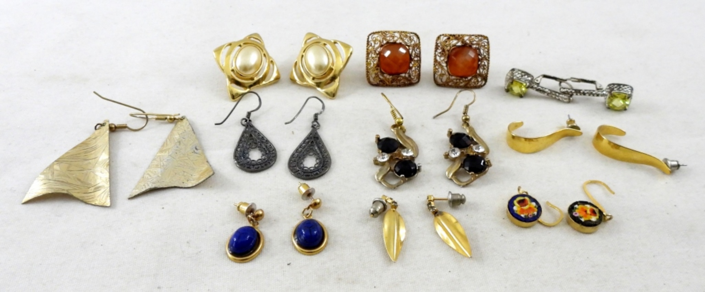 10 PAIRS OF GOLD TONE EARRINGS. SOME WITH RHINESTONES OTHERS WITH STONES. PEDANT AND STUDS. ALL IN GOOD CONDITION.