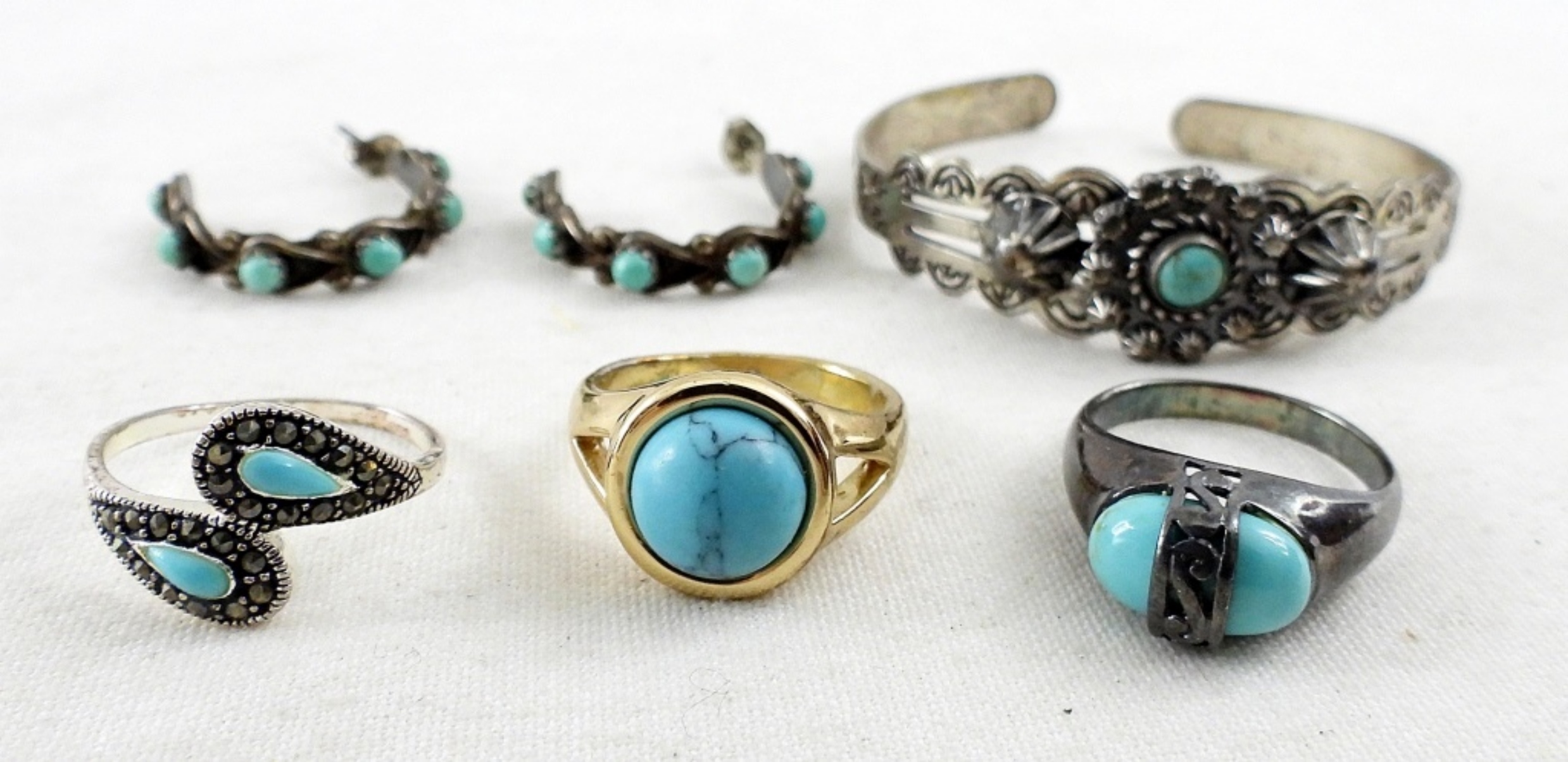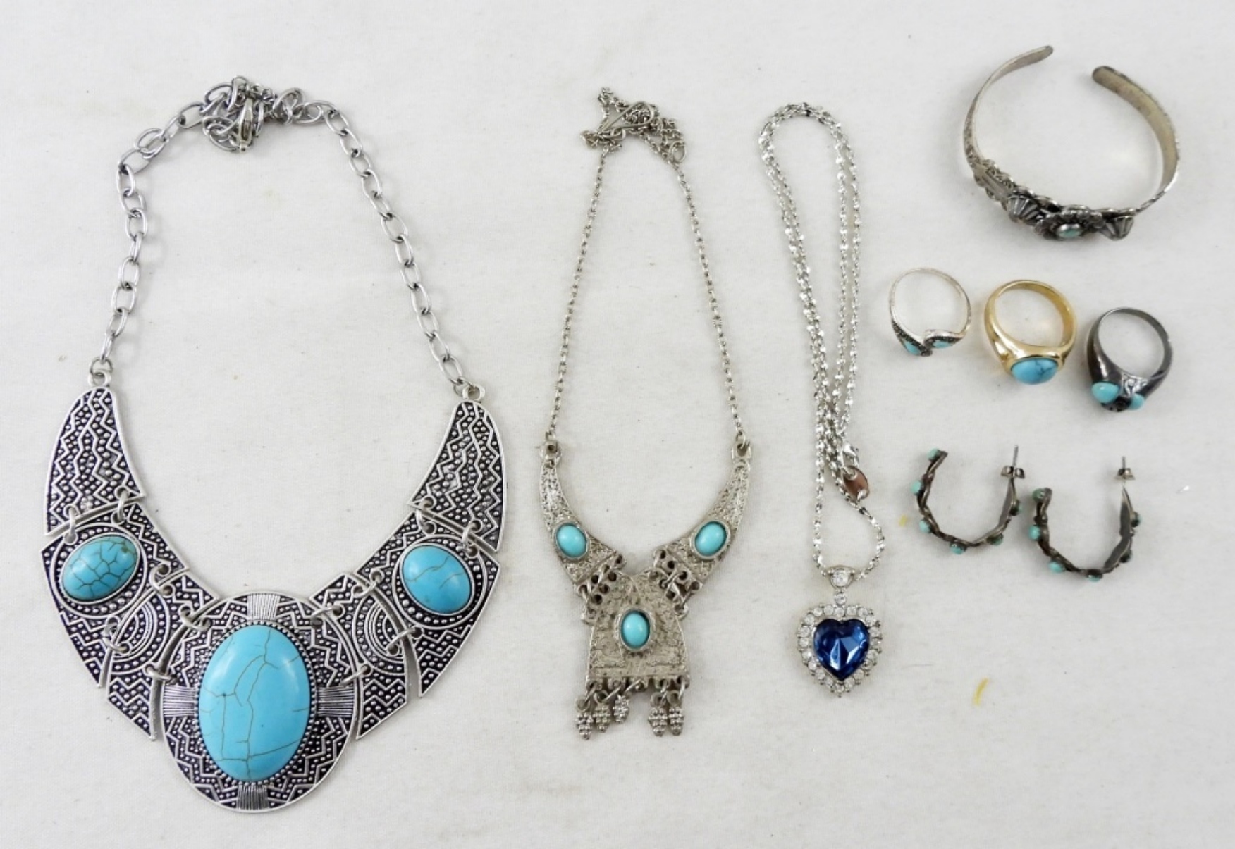 2 VTG TOURQUOISE STYLE NECKLACES 16″, 3 RING SIZES RANGE FROM 7 TO 9. SET OF STUD HOOP STYLE EARRINGS & BRACELET. 16″ SILVER TONED NECKLACE WITH RHINESTONE HEART. ALL IN GOOD CONDITION.