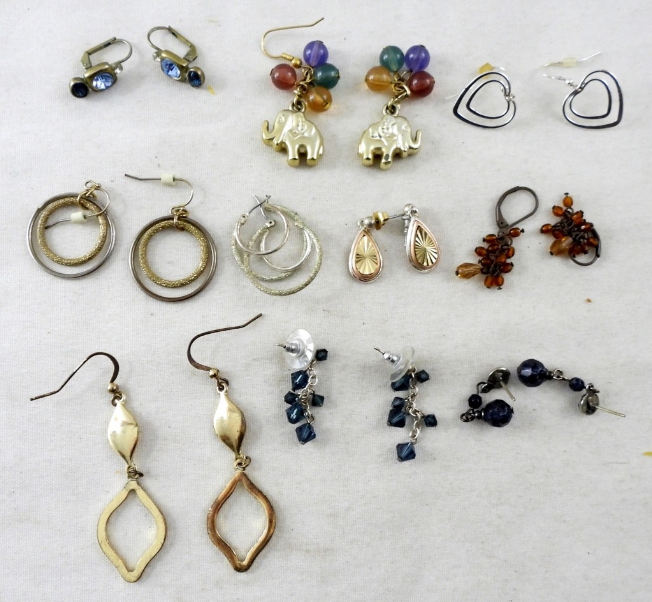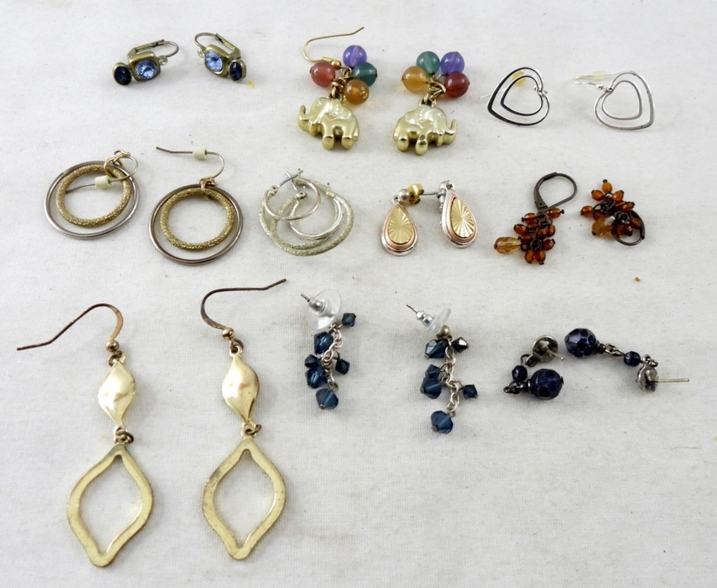 10 SETS OF MIXED EARRINGS- SOME RHINESTONE, BEADED, PENDANT, & STUD. MATCHING SETS ALL IN GOOD CONDITION.