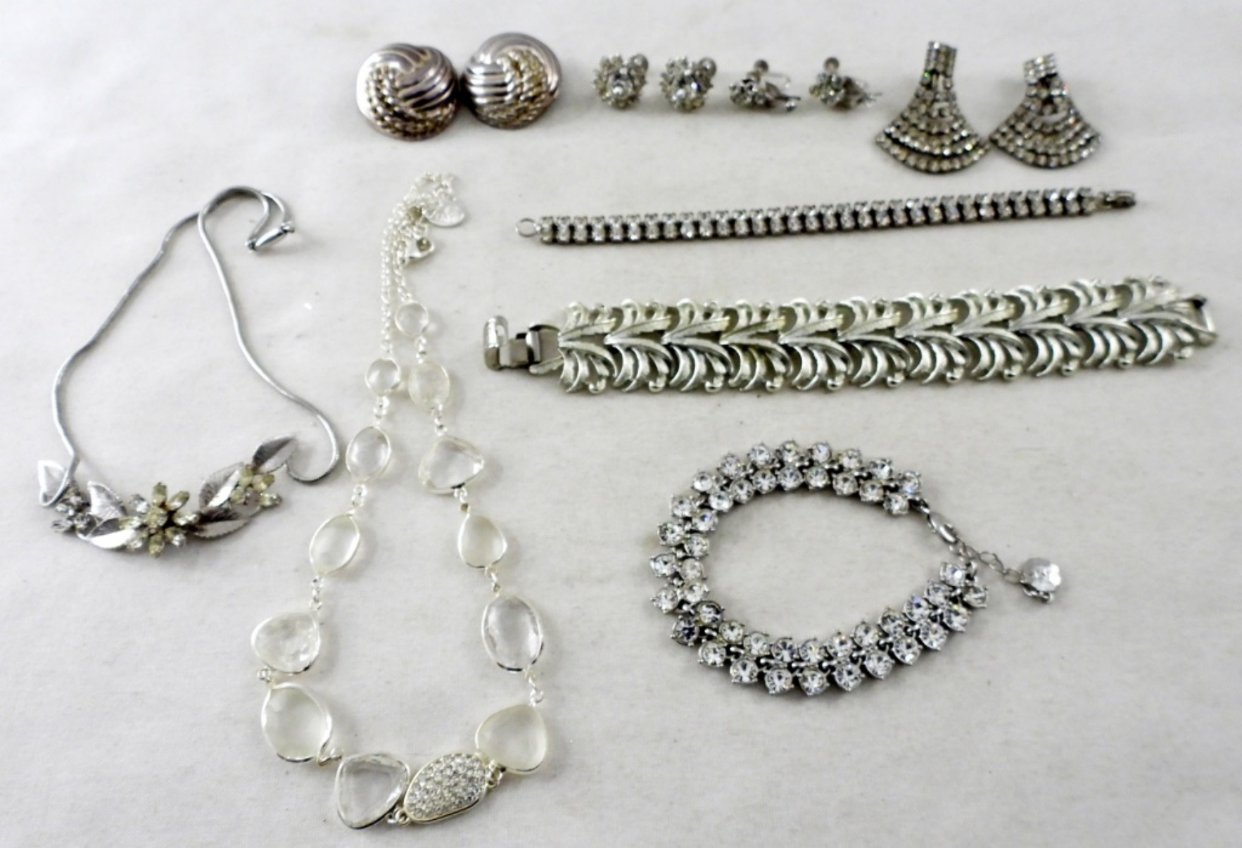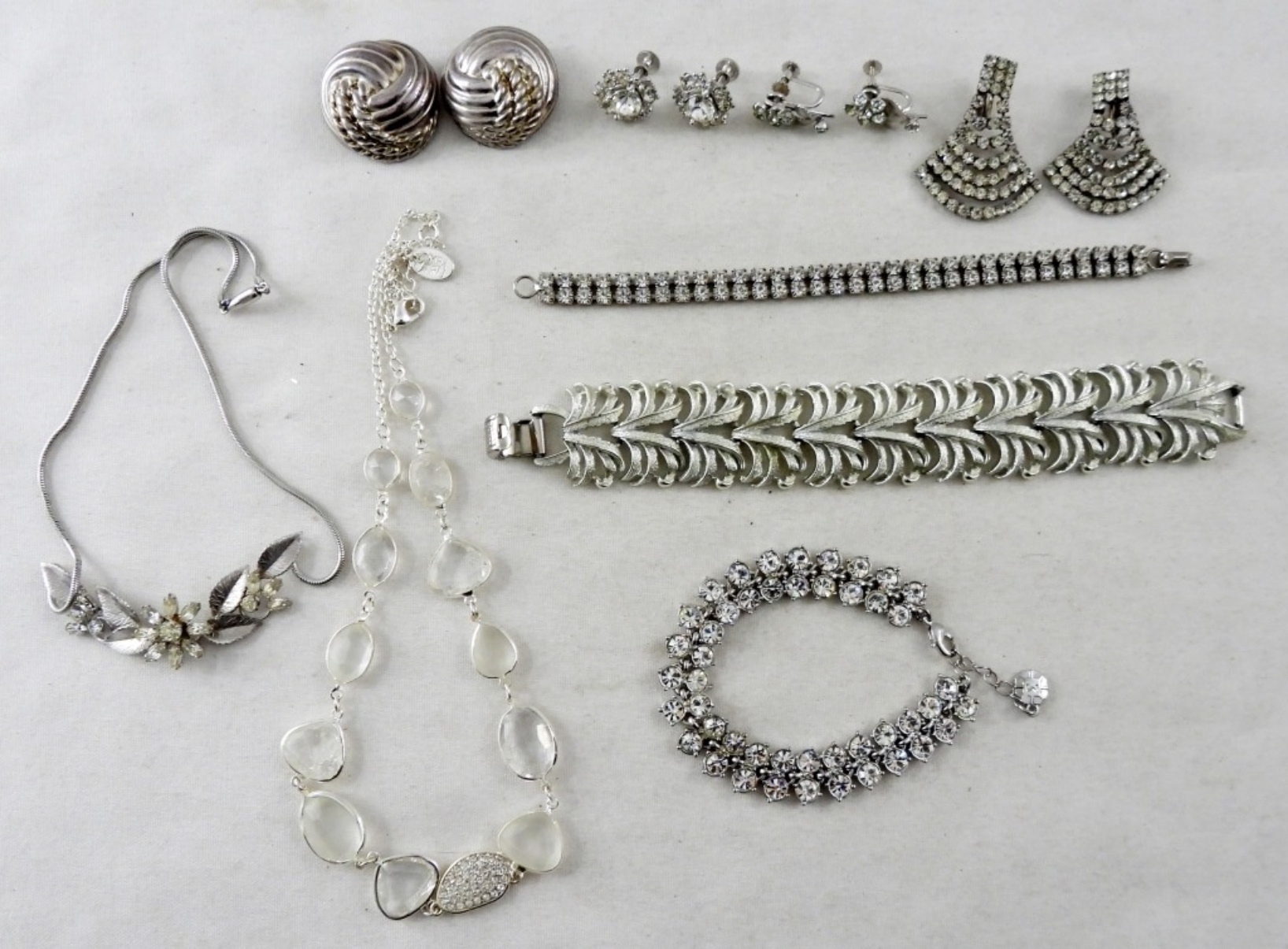 2- 16″ SILVER TONED NECKLACES WITH RHINESTONES, 4- PAIRS OF EARRINGS. 2 SETS WITH THE CLIP STYLE BACK, 2- SETS SCREW BACK. ALL IN GOOD CONDITION.