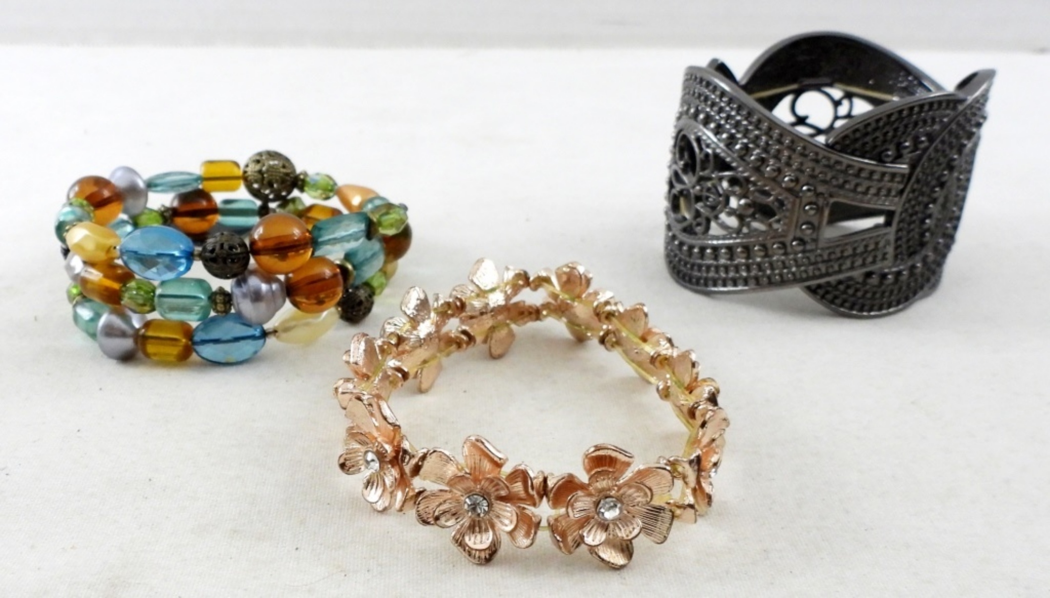 5- STUNNING BRACELETS. 1- CUFF SILVER TONE BRACELET, 1- FLORAL CLASP BRACELET ALL DIFFERENT COLORS & HAS VARIOUS DIFFERENT FLOWERS. 1- GOLD TONE BRACELET WITH RED AND PURPLE RHINESTONES. AS WELL AS PEACH COLORED