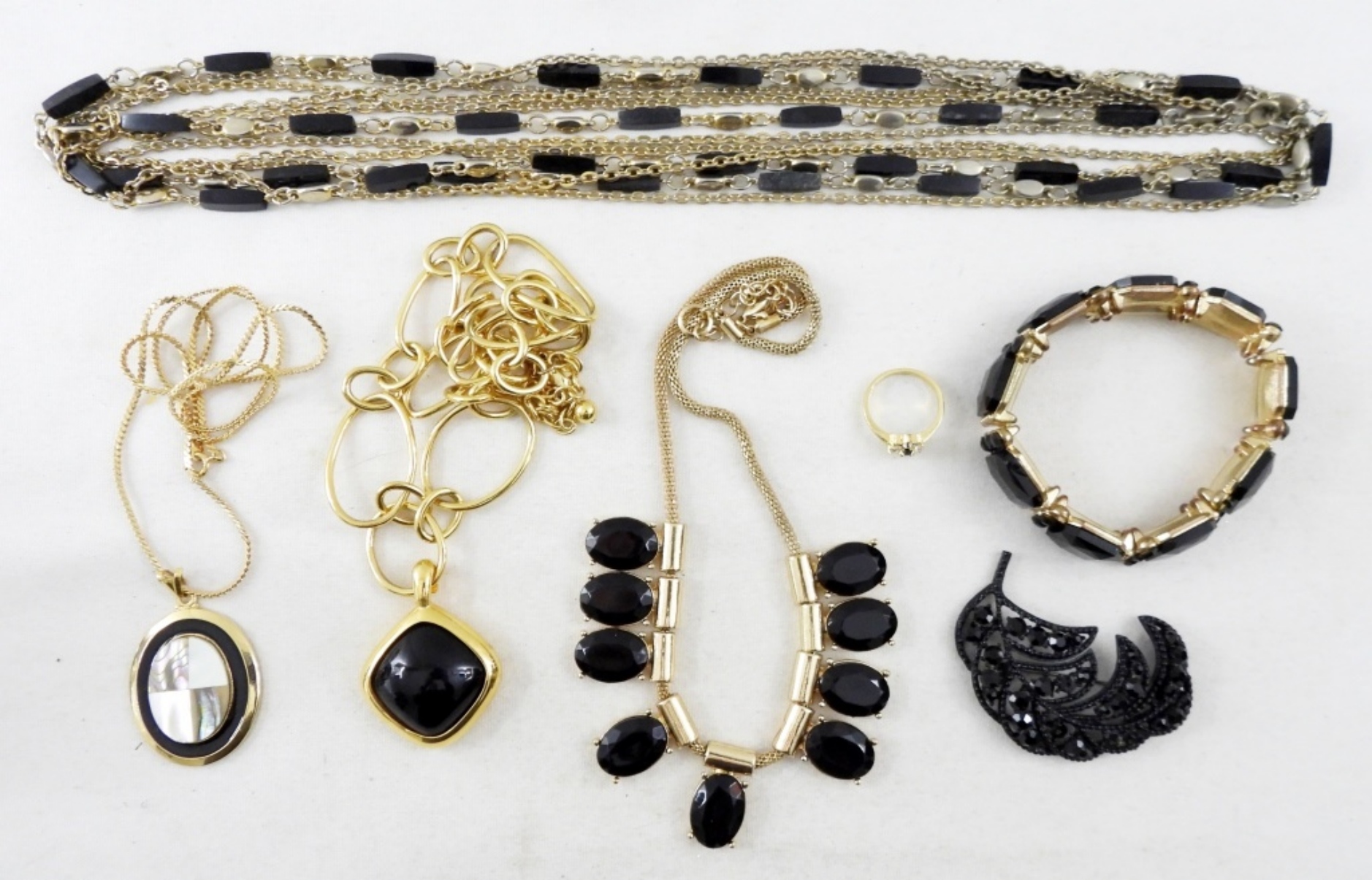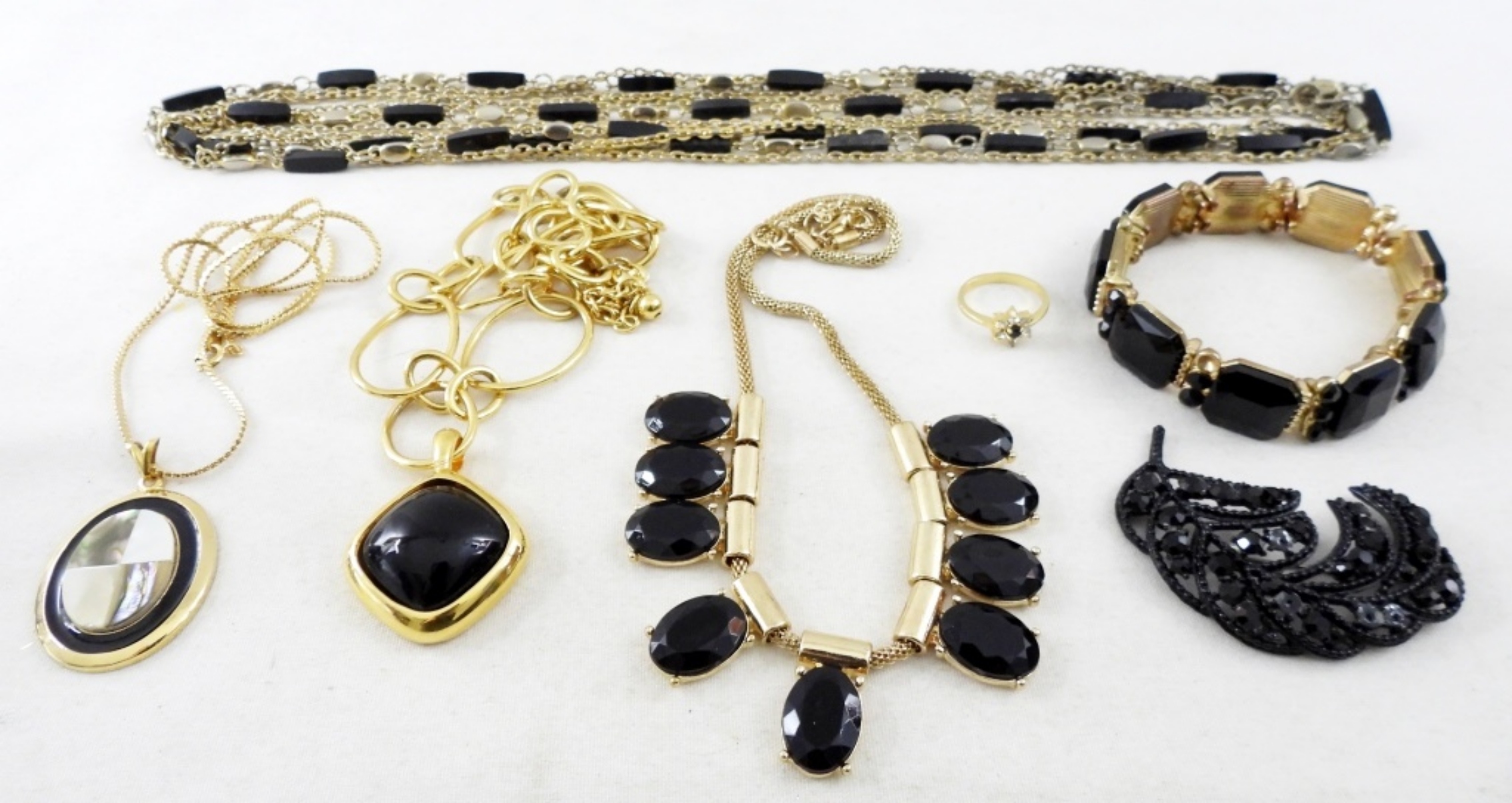 4- GOLD TONE NECKLACES WITH BLACK RHINESTONE & STONE ACCENTS. SIZES RANGE FROM 16″-24″. STUNNING GOLD TONE AND BLACK RHINESTONE BRACELET. BLACK RHINESTONE STYLE BROOCH. SIZE 6-7 RING WITH FLOWER CLEAR AND BLACK
