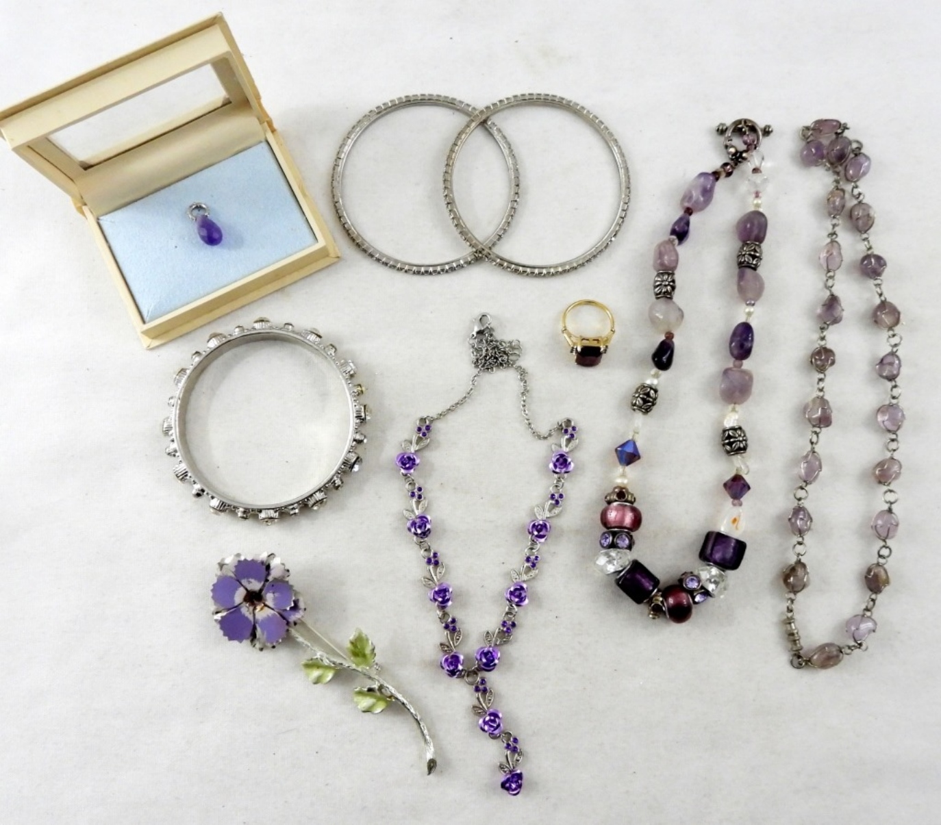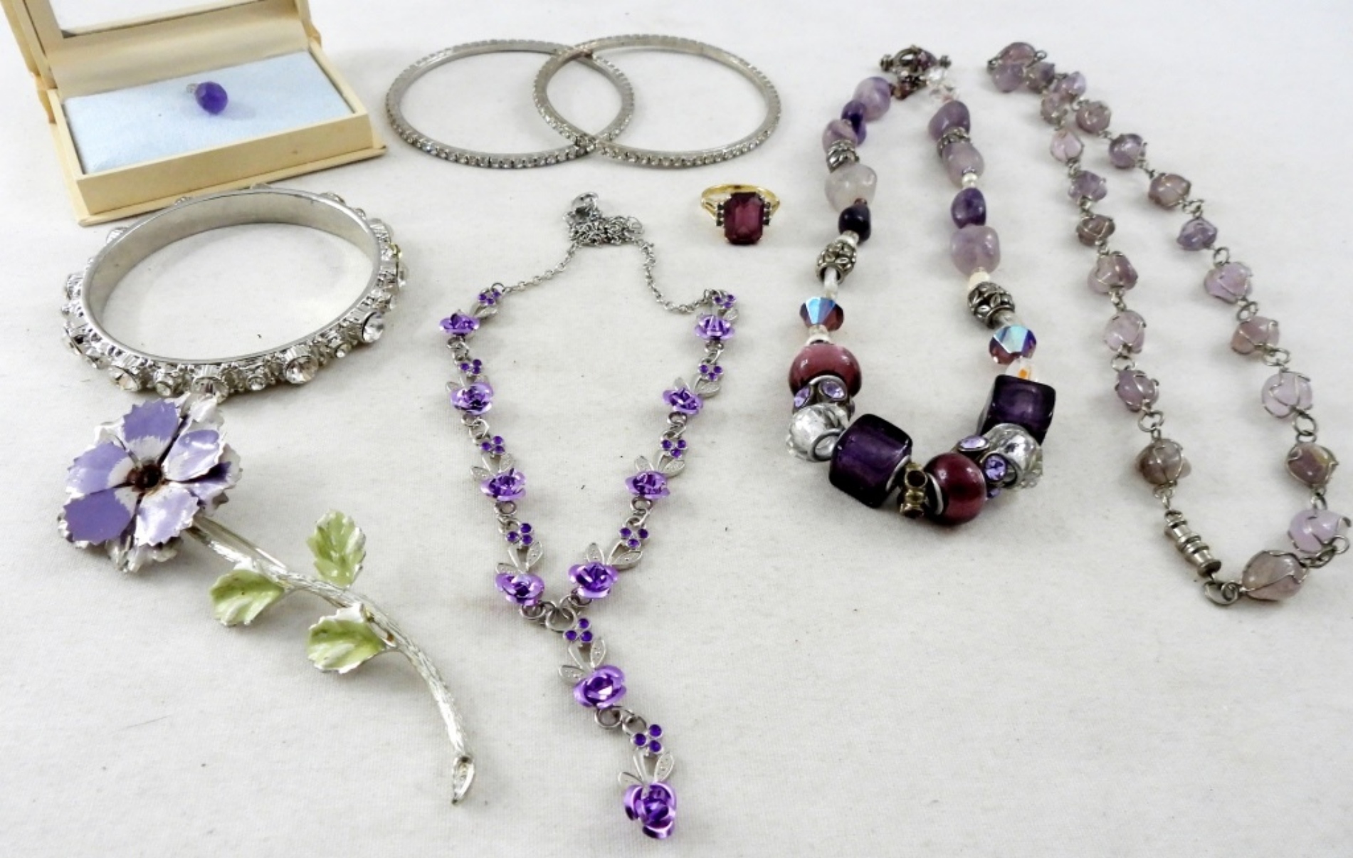 3- PURPLE ACCENTED NECKLACES WITH SILVER TONES. 3- RHINESTONE BRACELETS. PURPLE FLOWER BROOCH. MONET PURPLE STONE PENDANT. GOLD TONE WITH PURPLE RHINESTONE RING SIZE 8. ALL IN GOOD CONDITION.