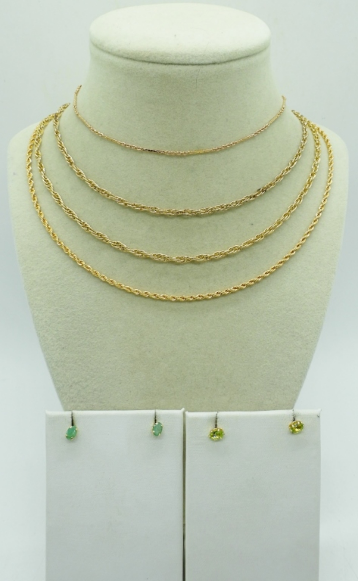 TWO PAIR OF GOLD TONE, GREEN GEMSTONE STUD EARRINGS. FOUR GOLD TONE CHAINS, 18″, 24″, 30″.