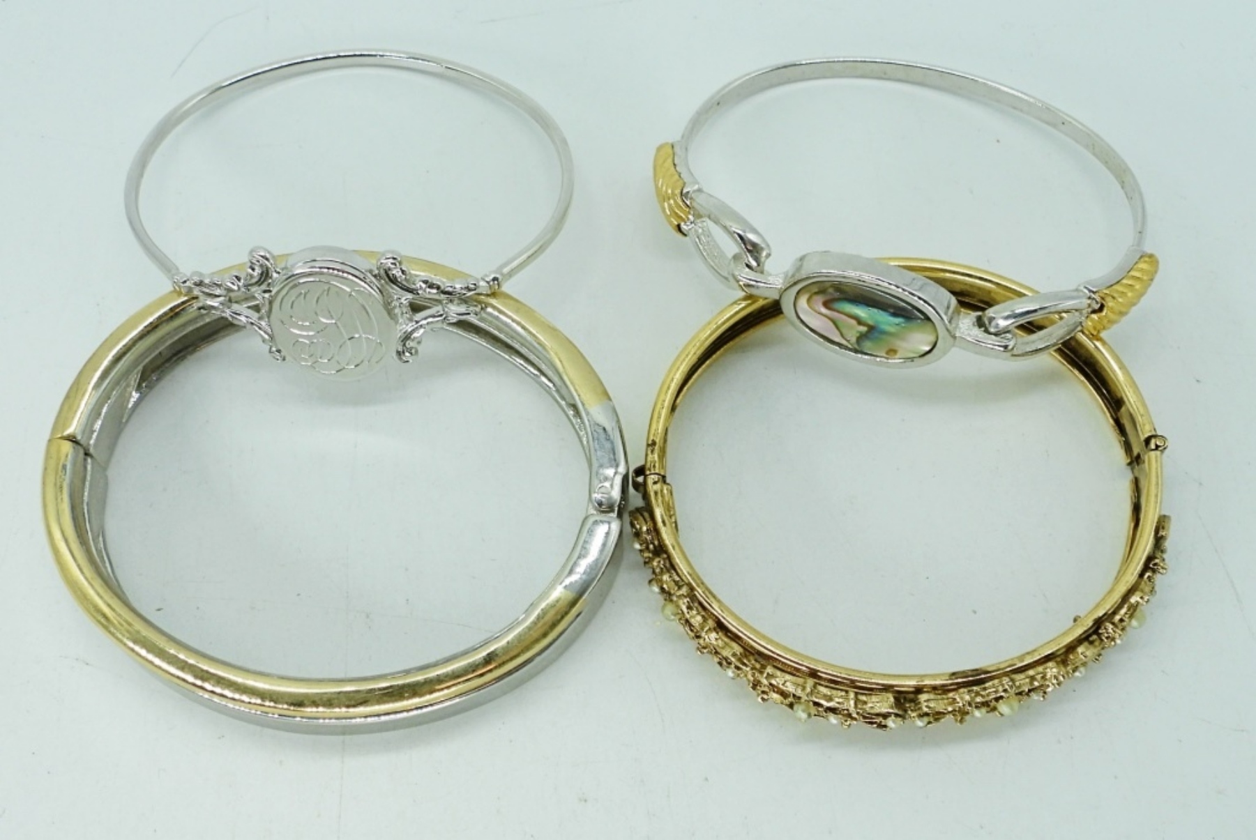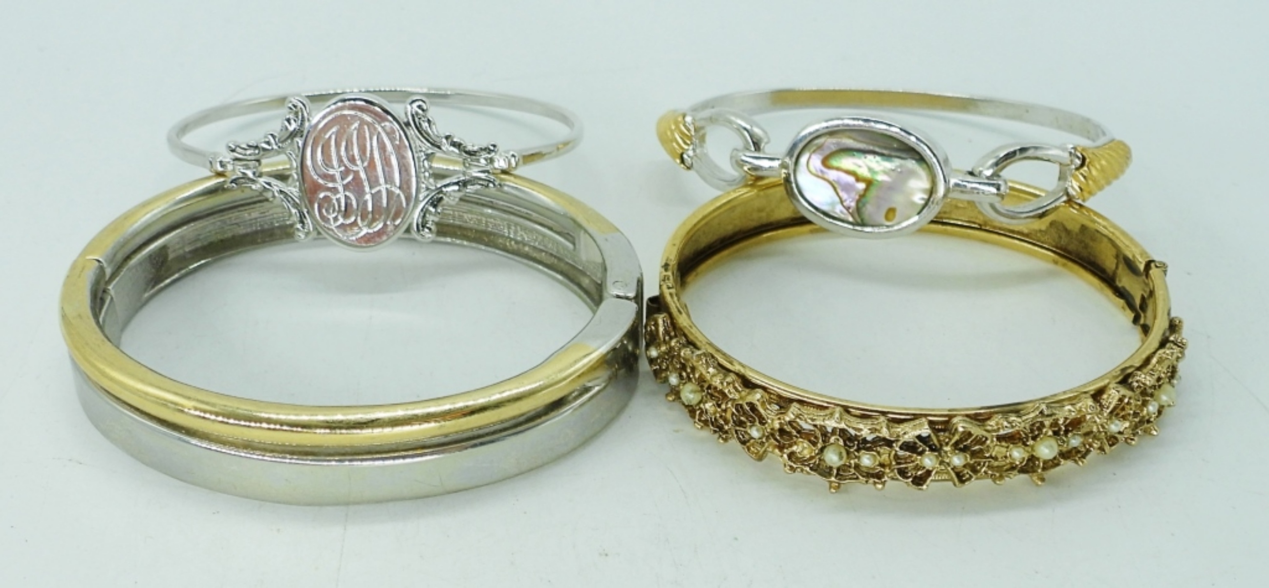 FOUR GOLD AND SILVER TONE BANGLE BRACELETS. ALL HINGED.