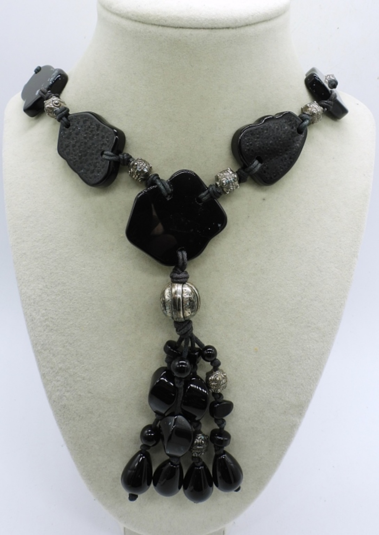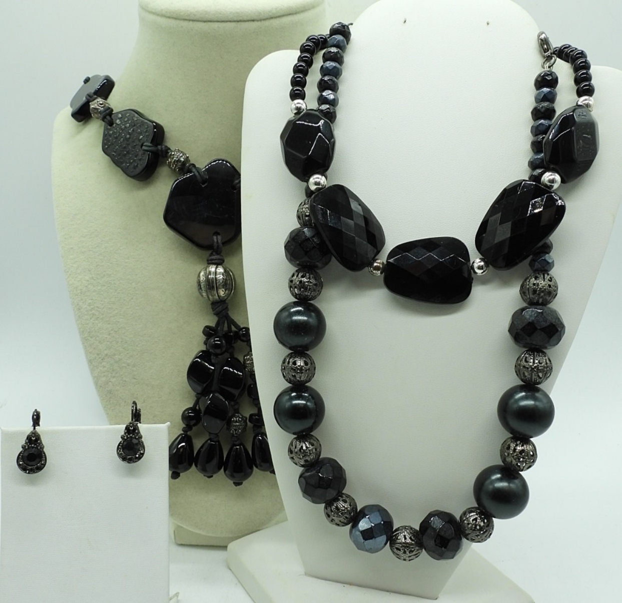 4 PIECE BLACK AND SILVER TONE JEWELRY SET, 32″ BLACK GEM STONE NECKLACE ,(2) 18″ BLACK BEADED NECKLACE AND A PAIR OF BLACK VINTAGE EARRINGS
