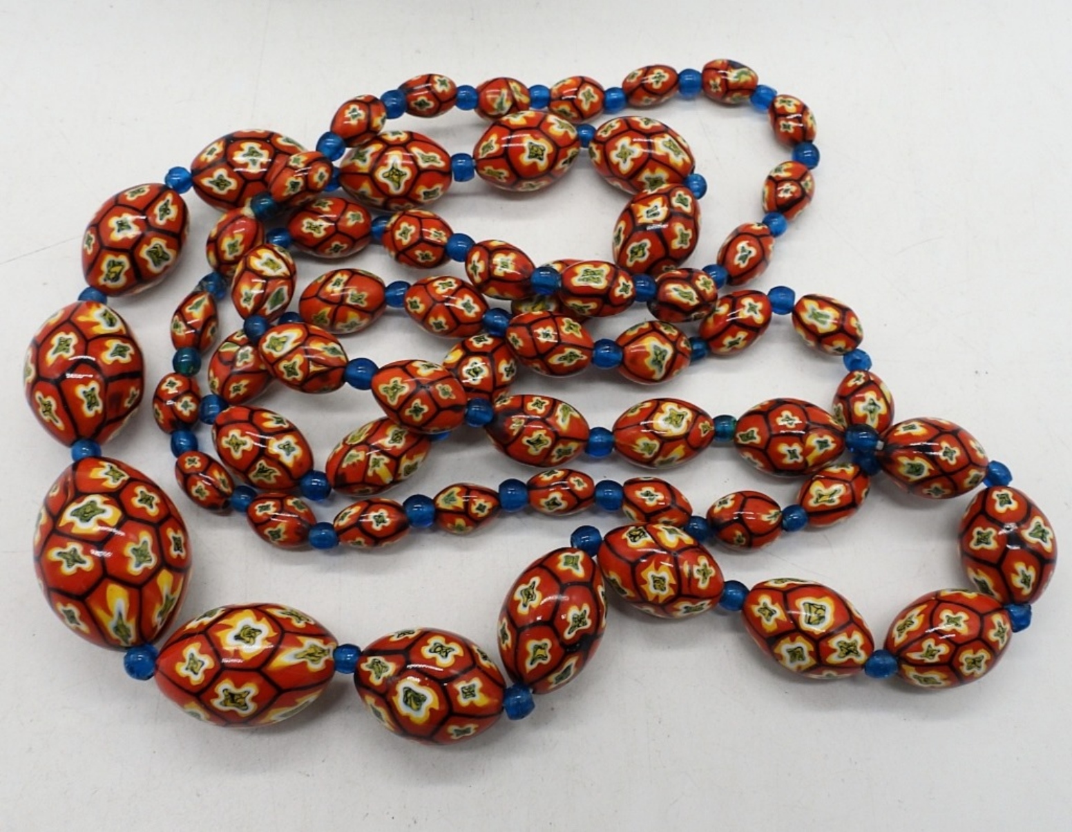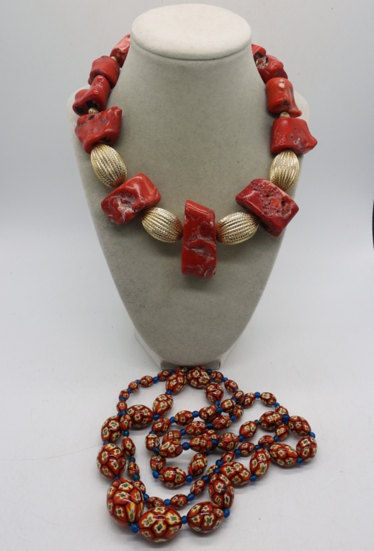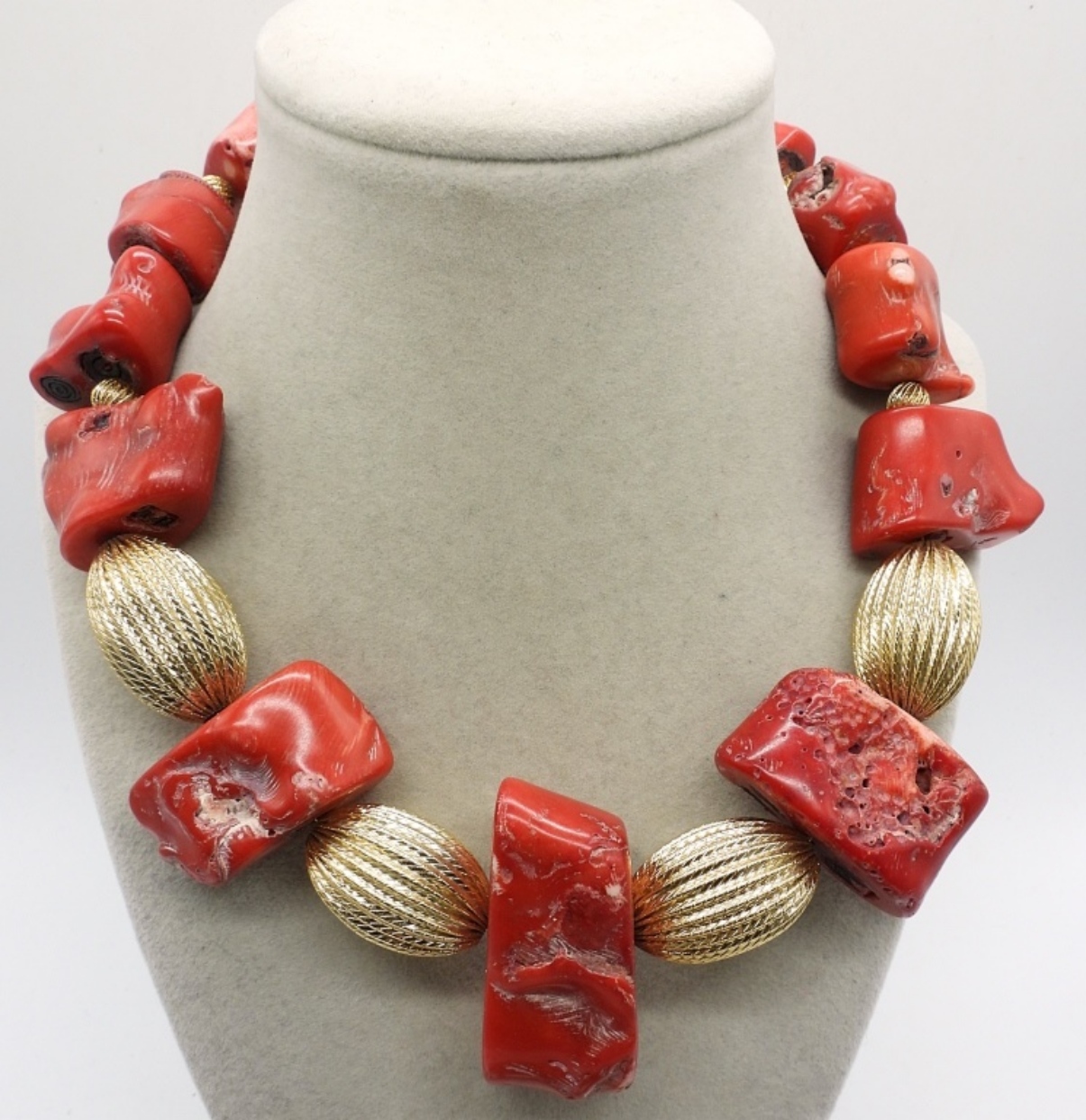 VERY LARGE RED CORAL CHUNKS BEADED ON A WIRE NECKLACE WITH GOLD TONE BEADS, 17″. HEAVY READ BEADED NECKLACE 42″