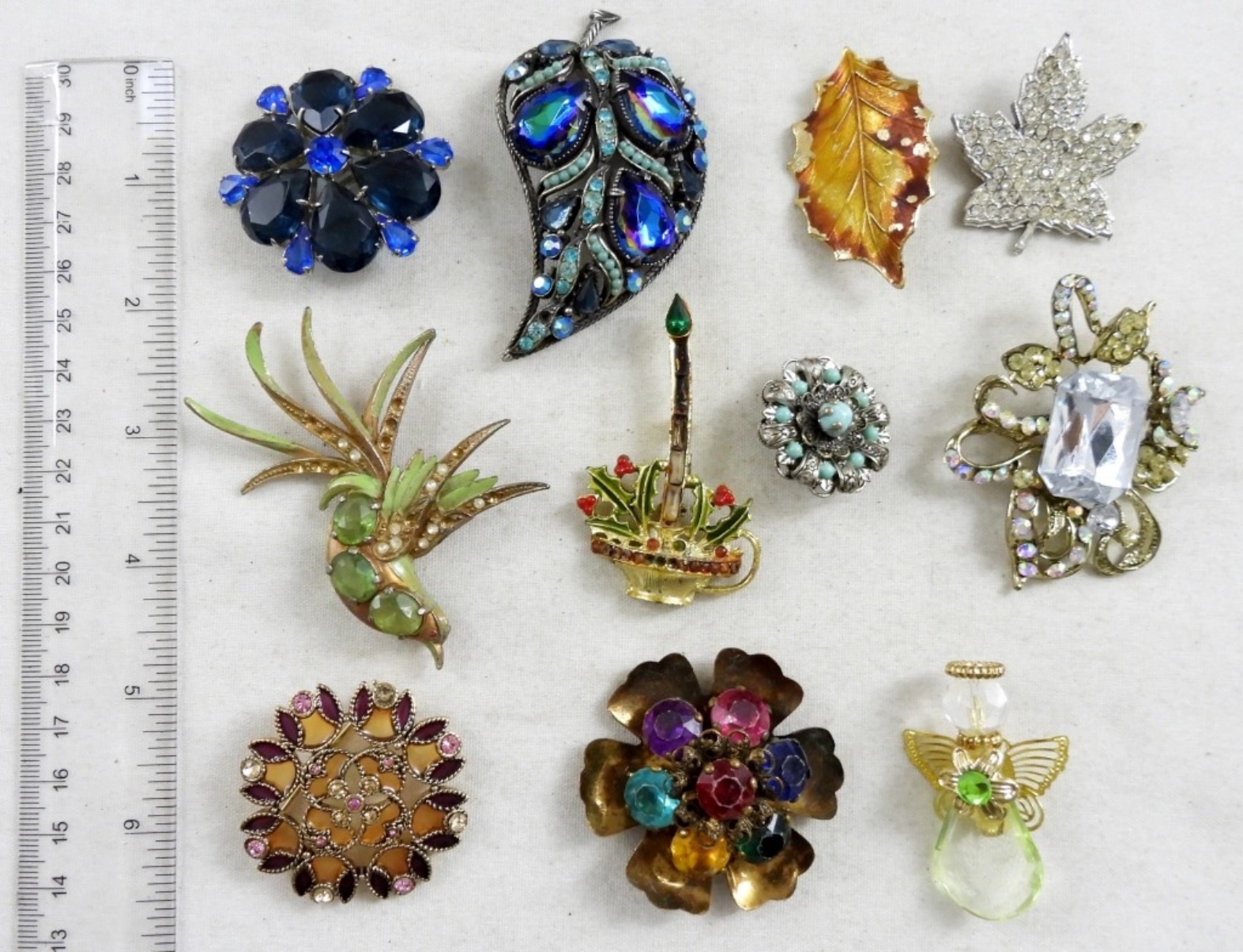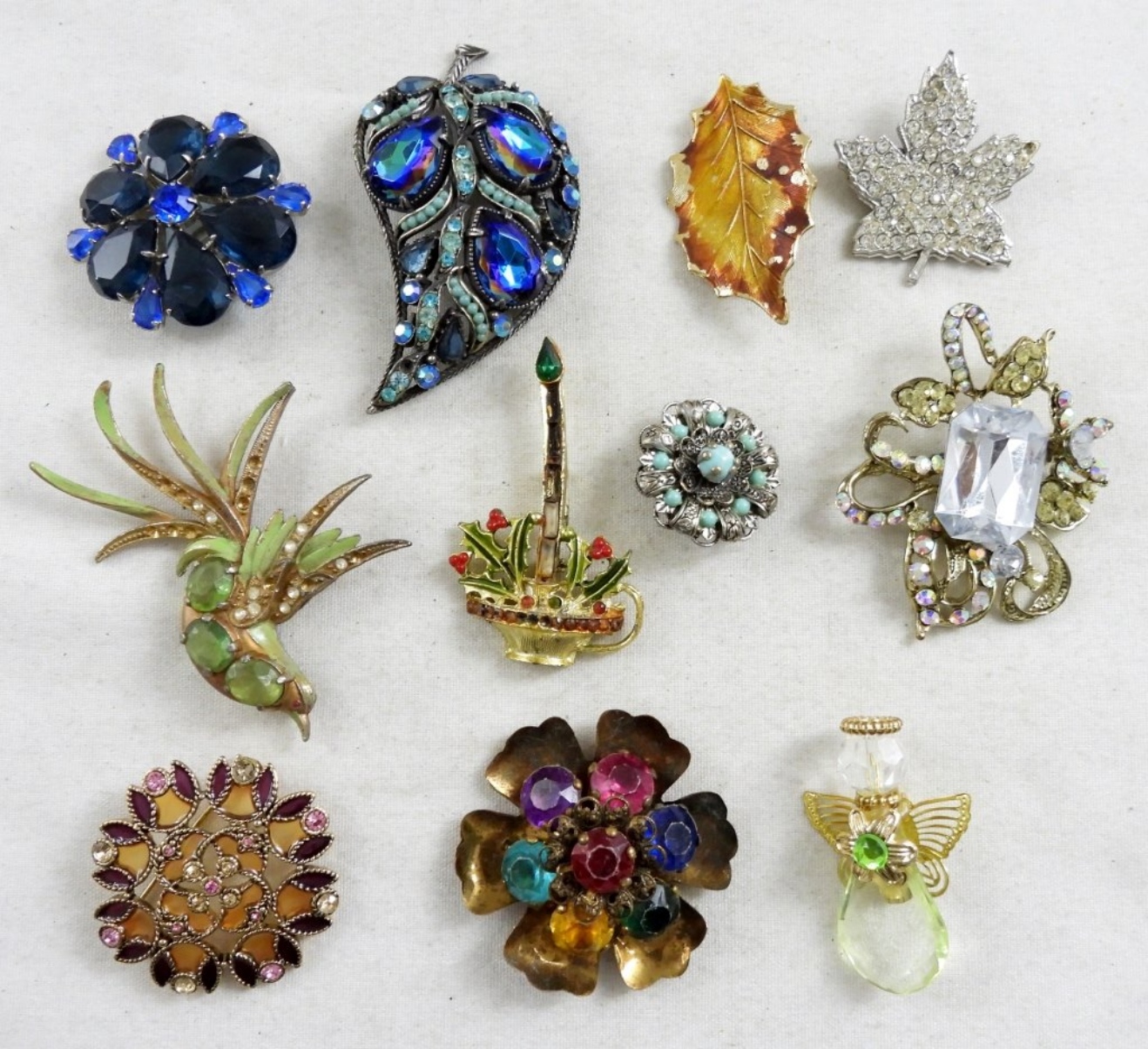 11 ASSORTED BROOCHES, BID NOW!, ONE HAS A BROKEN PIN