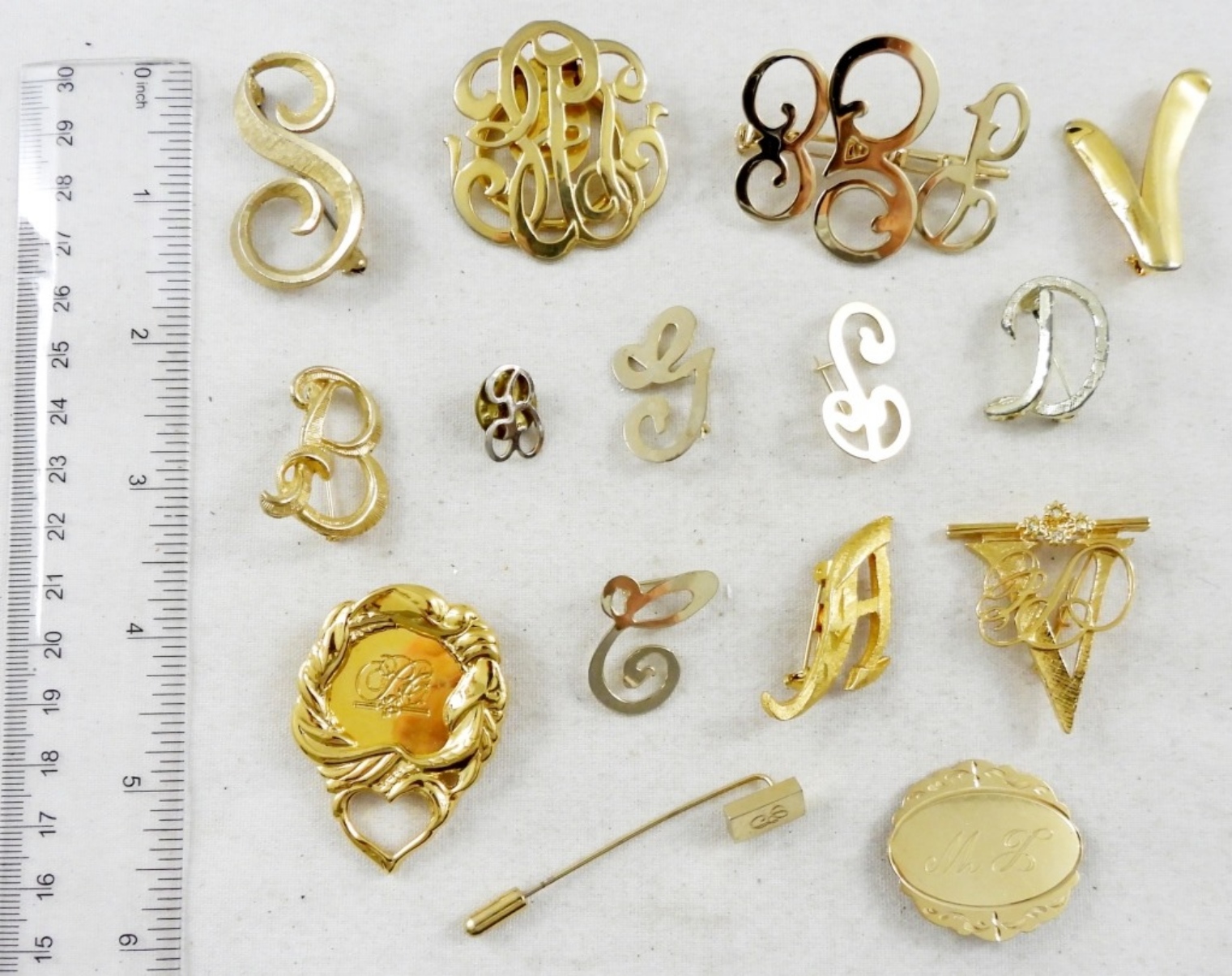 15 ASSORTED MONOGRAM AND LETTER BROOCHES, BID NOW!