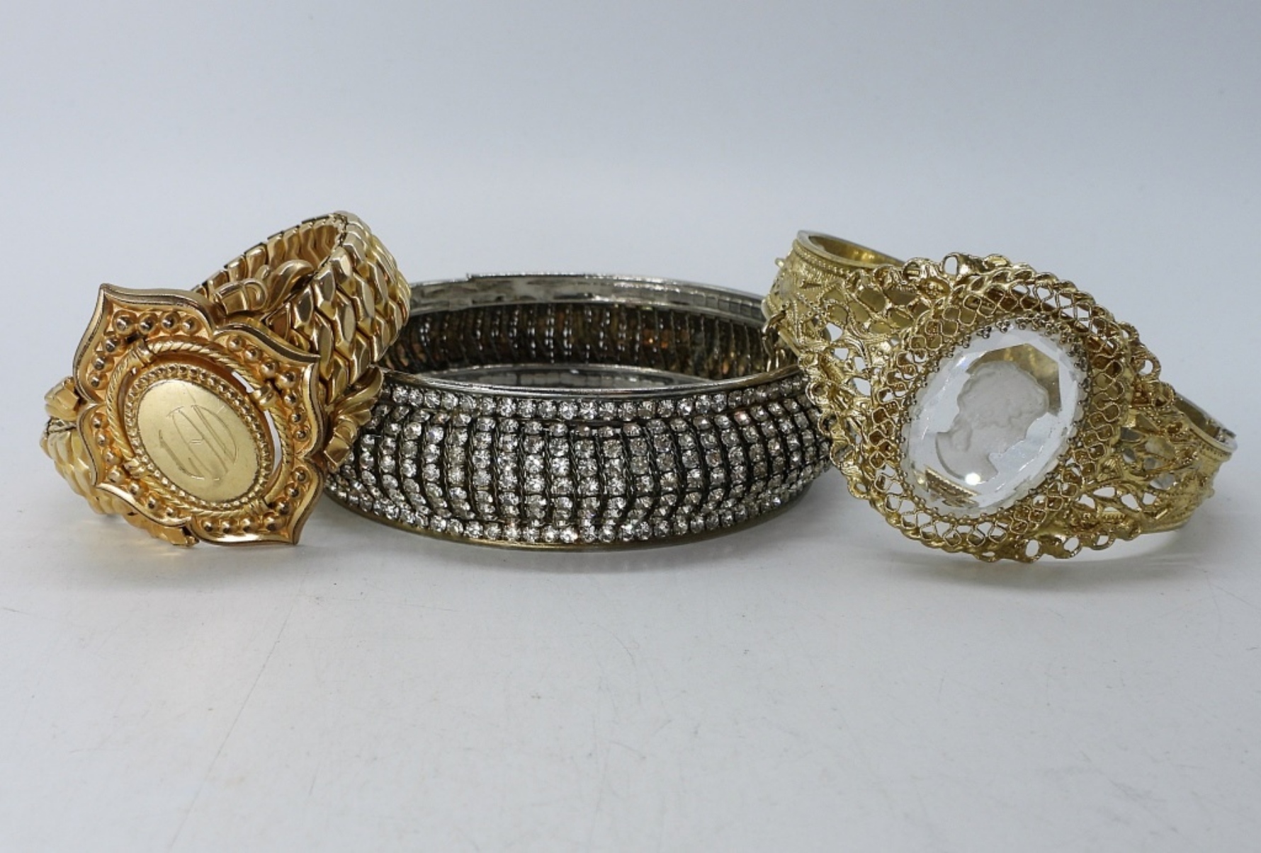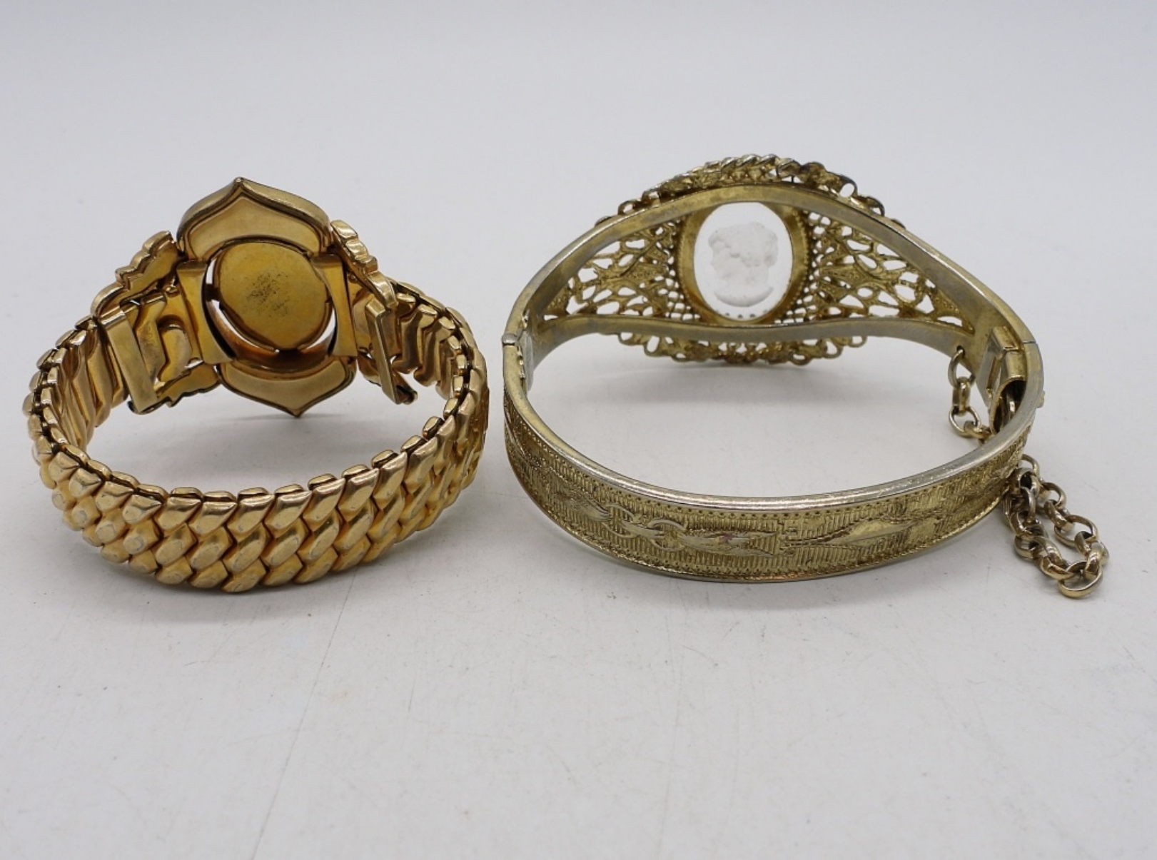 TWO GOLD TONE VINTAGE CAMEO & ENGRAVED BRACELETS. SILVER TONE BANGLE BRACELET 6- 9″.