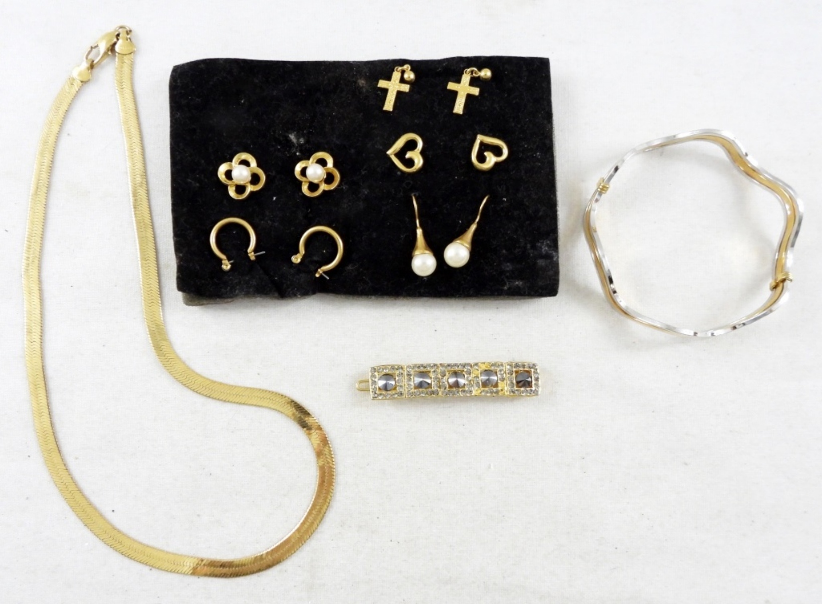 5 PAIRS OF EARRINGS, 1 HAIR CLIP, 1 NECKLACE 16IN, AND 1 BRACELET, BID NOW!