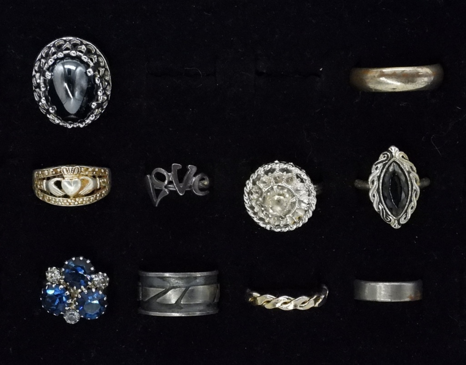 SIZES 5-12. TEN SILVER & BLACK TONE FASHION RINGS.