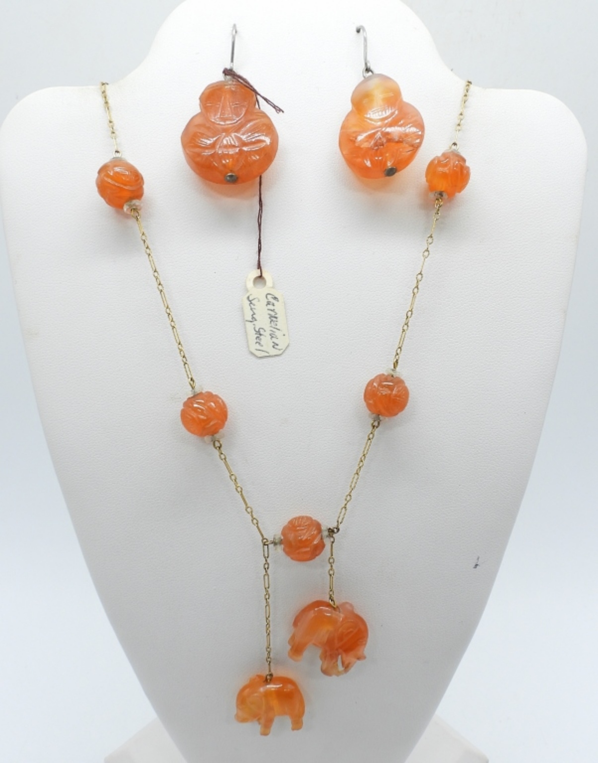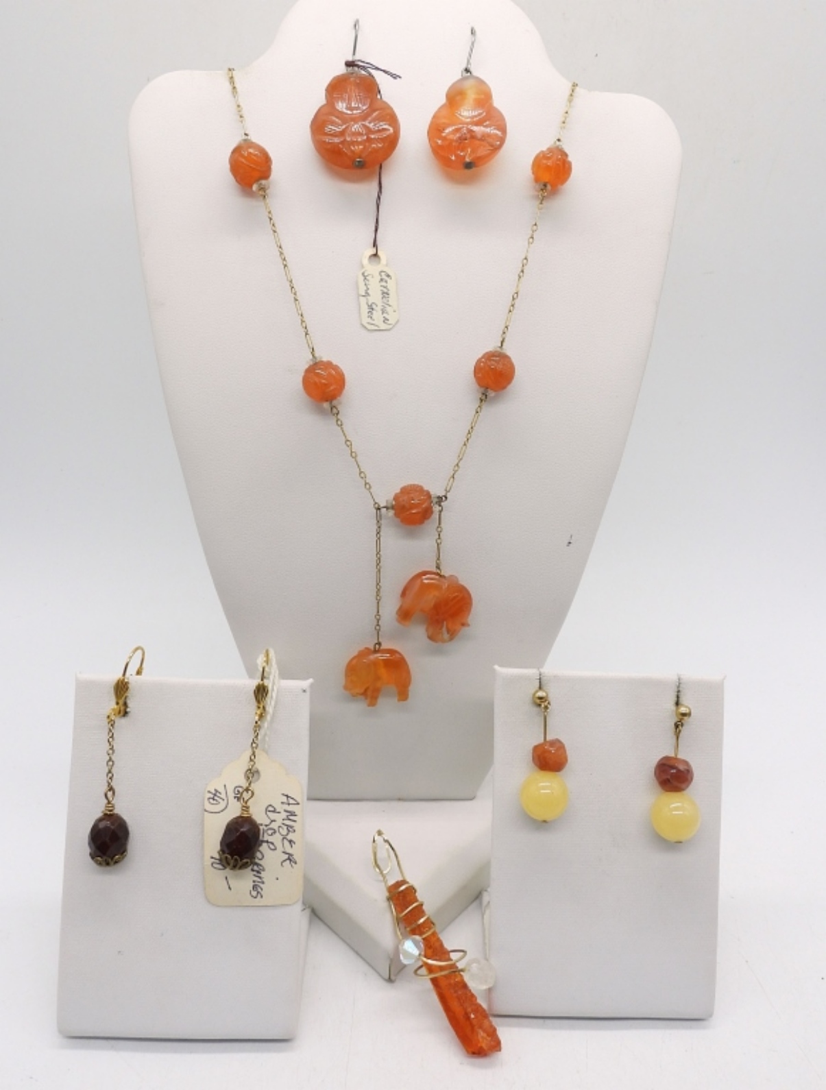 CARNELIAN ELEPHANT BEADS ON A BEAUTIFUL NECKLACE WITH CARNELIAN EARRINGS. RAW AMBER PENDANT AND TWO PAIR OF PIERCED EARRINGS. VERY NICE PIECES!