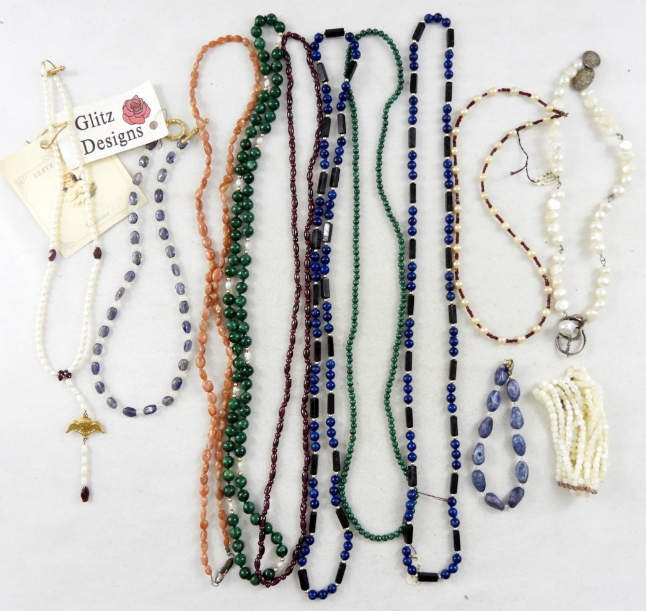 10 HANDMADE NATURAL GEMSTONE NECKLACES. GARNET, PEARL, MALACHITE, IOLITE, MOONSTONE & MORE! TWO GEMSTONE BRACELETS.