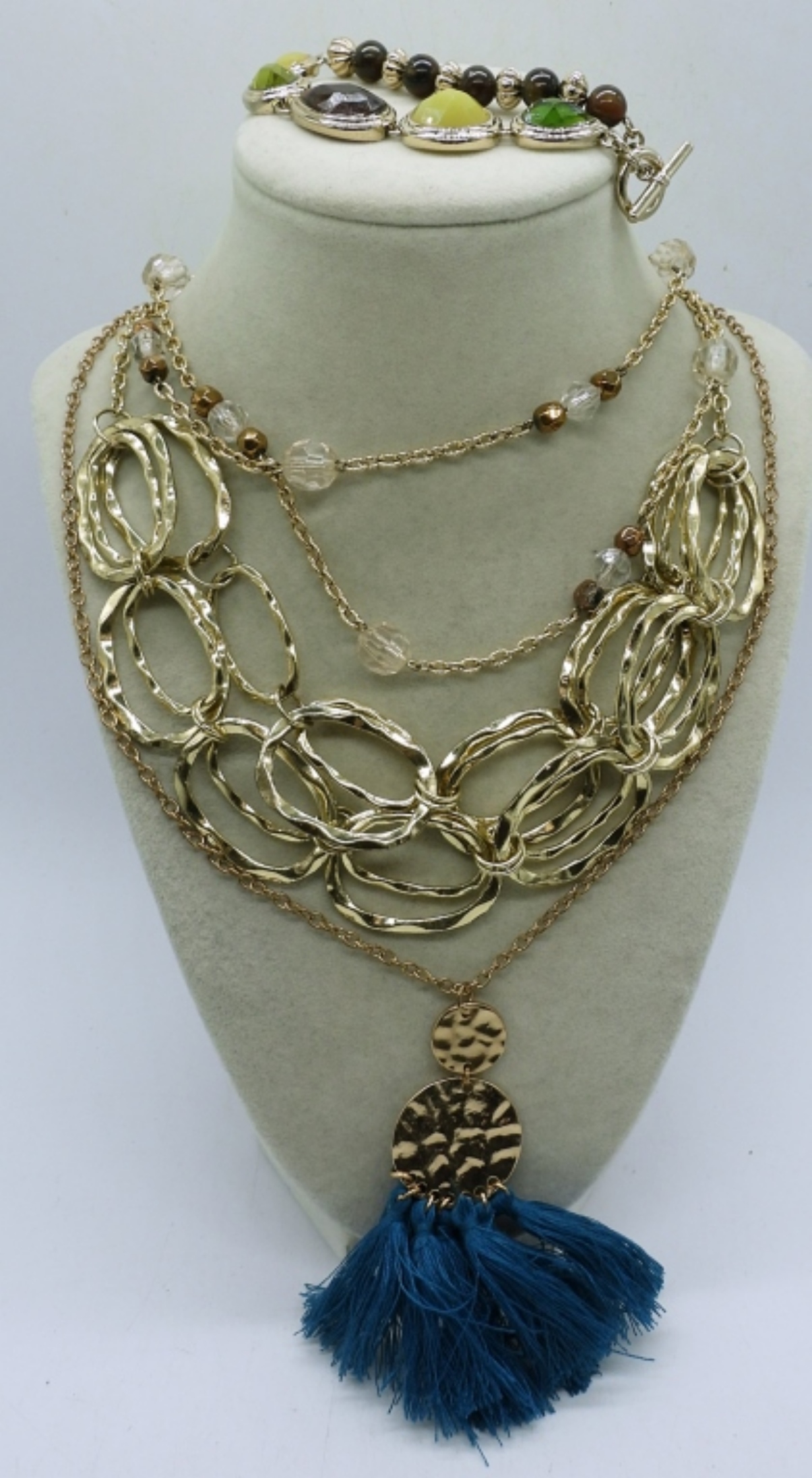 (4) PIECE GOLD TONE LADIES FASHION JEWELRY,(3) GOLD TONE FASHION NECKLACES SIZE 20’28 AND , 35’AND A 3′ GOLD TONE BRACELET WITH COLORED GEM STONES