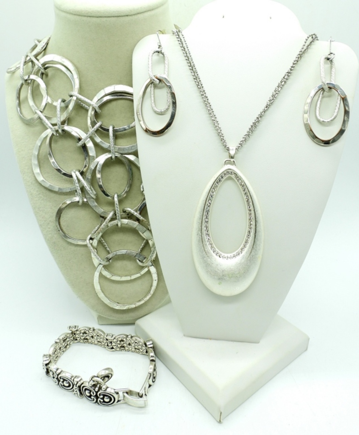 (4) LADIES SILVER TONE FASHION JEWELRY,18″MULTI LAYERED CHAIN NECKLACE WITH MATCHING EARRINGS ,32″ NECKLACE WITH SILVER TONE PENDANT AND A 3″ CLASP BRACELET