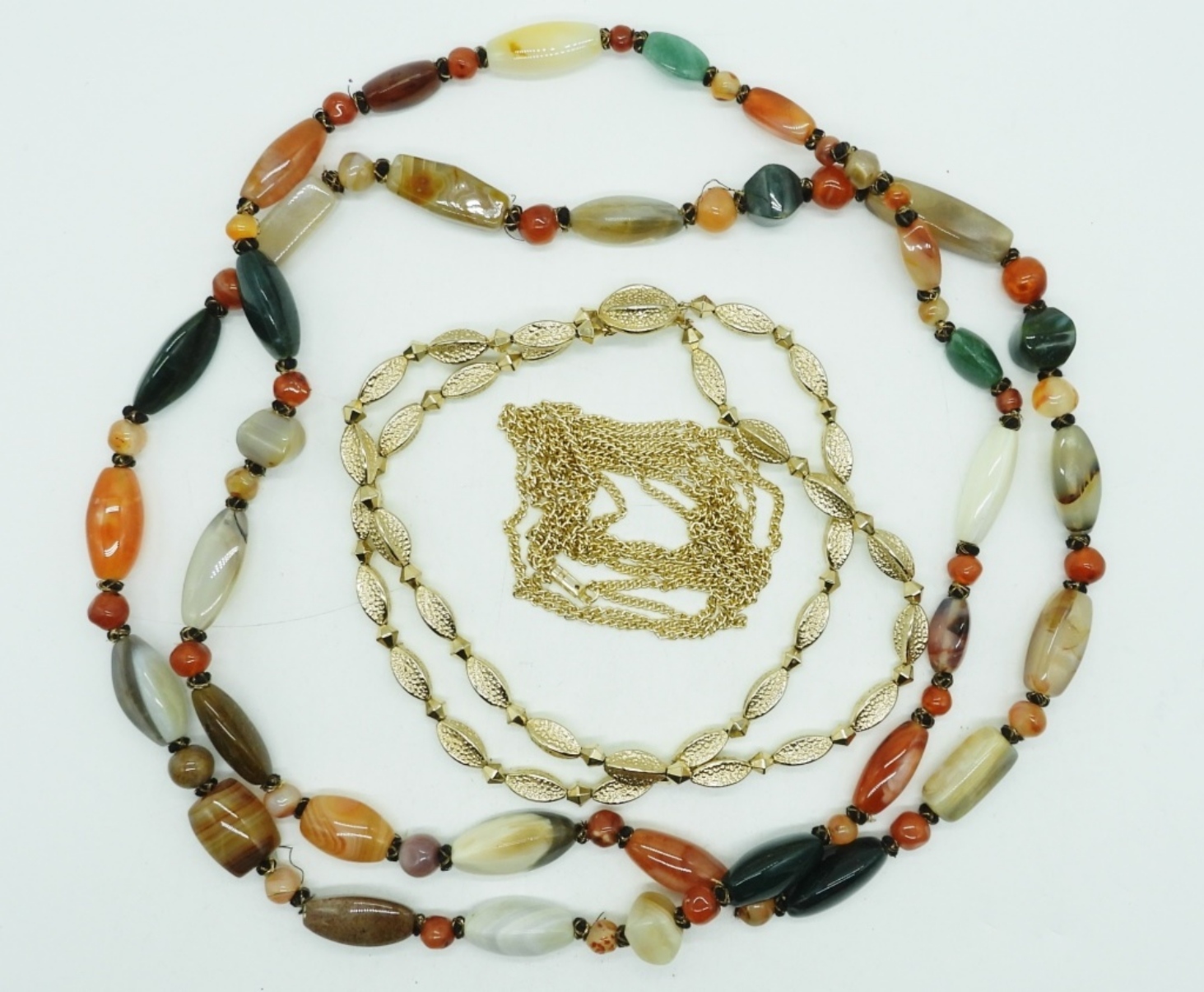 VERY NICE, VERY LARGE NATURAL GEMSTONE NECKLACE, 52″. TWO GOLD TONE NECKLACES, 15-32″.