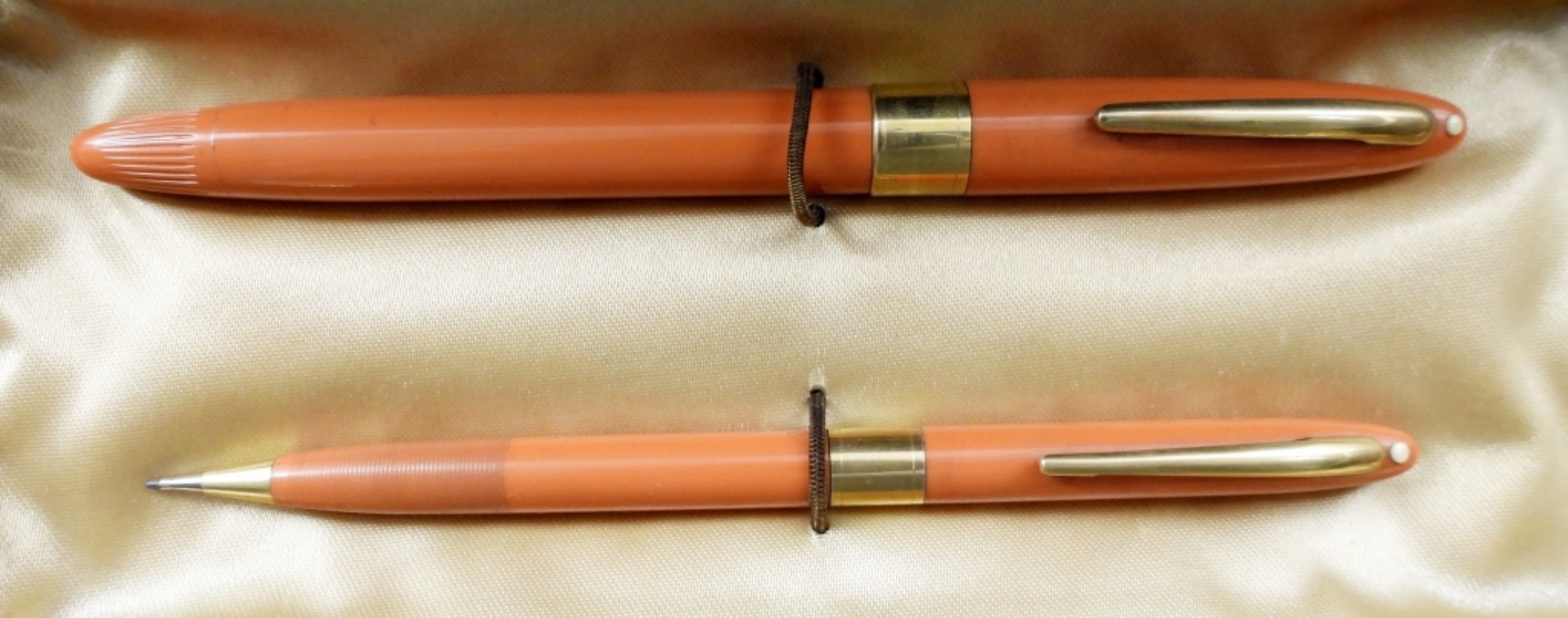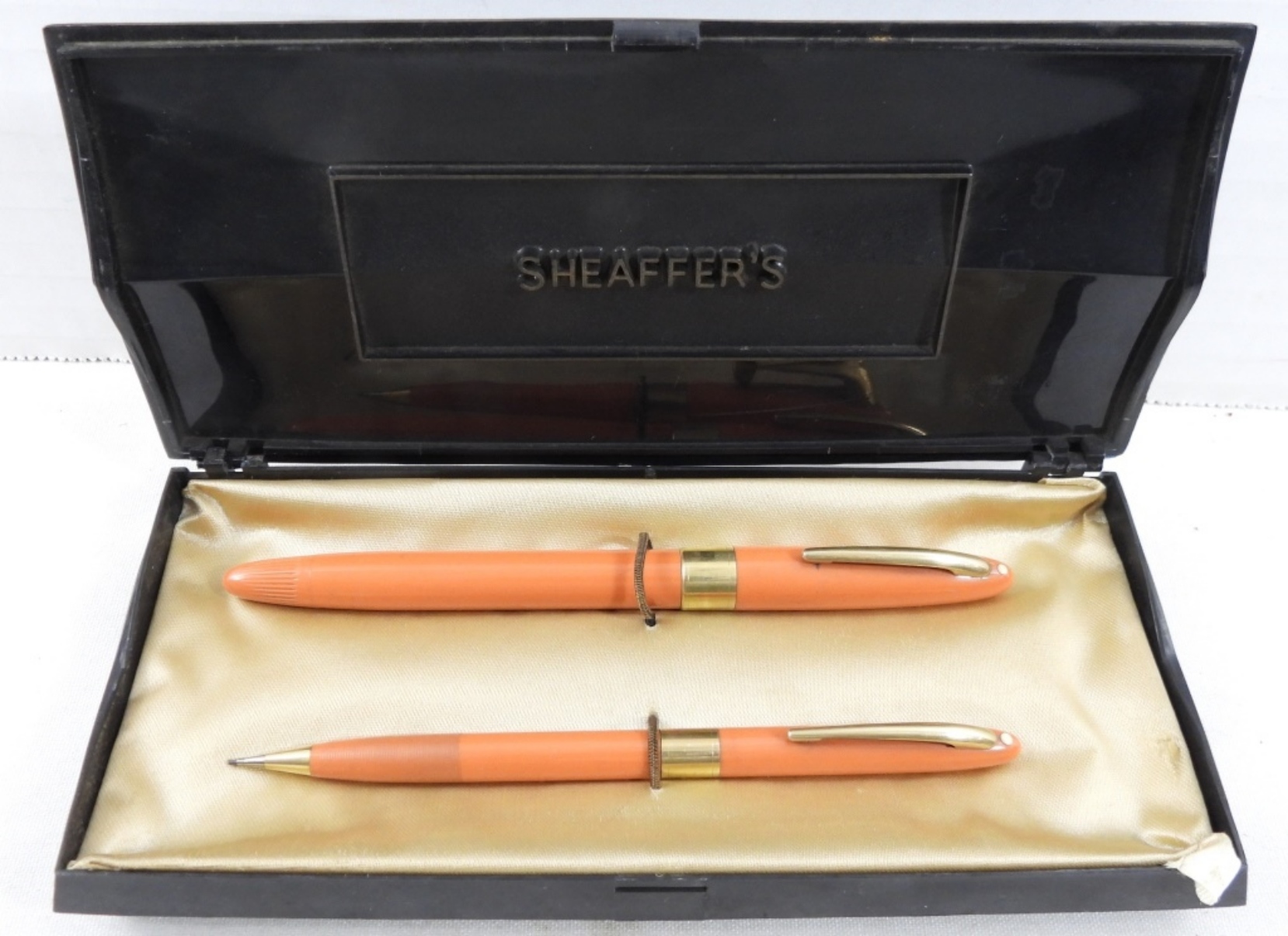 VINTAGE SHEAFFER PFM (PEN FOR MEN) FINE NIB TIP AND MECHANICAL PENCIL (UNTESTED BUT TWIST TO REFILL INK AND EXPAND PENCIL LEAD WORKING) CORAL COLOR, IN ORIGINAL PACKAGING WITH ORIGINAL INSTRUCTIONS INSIDE